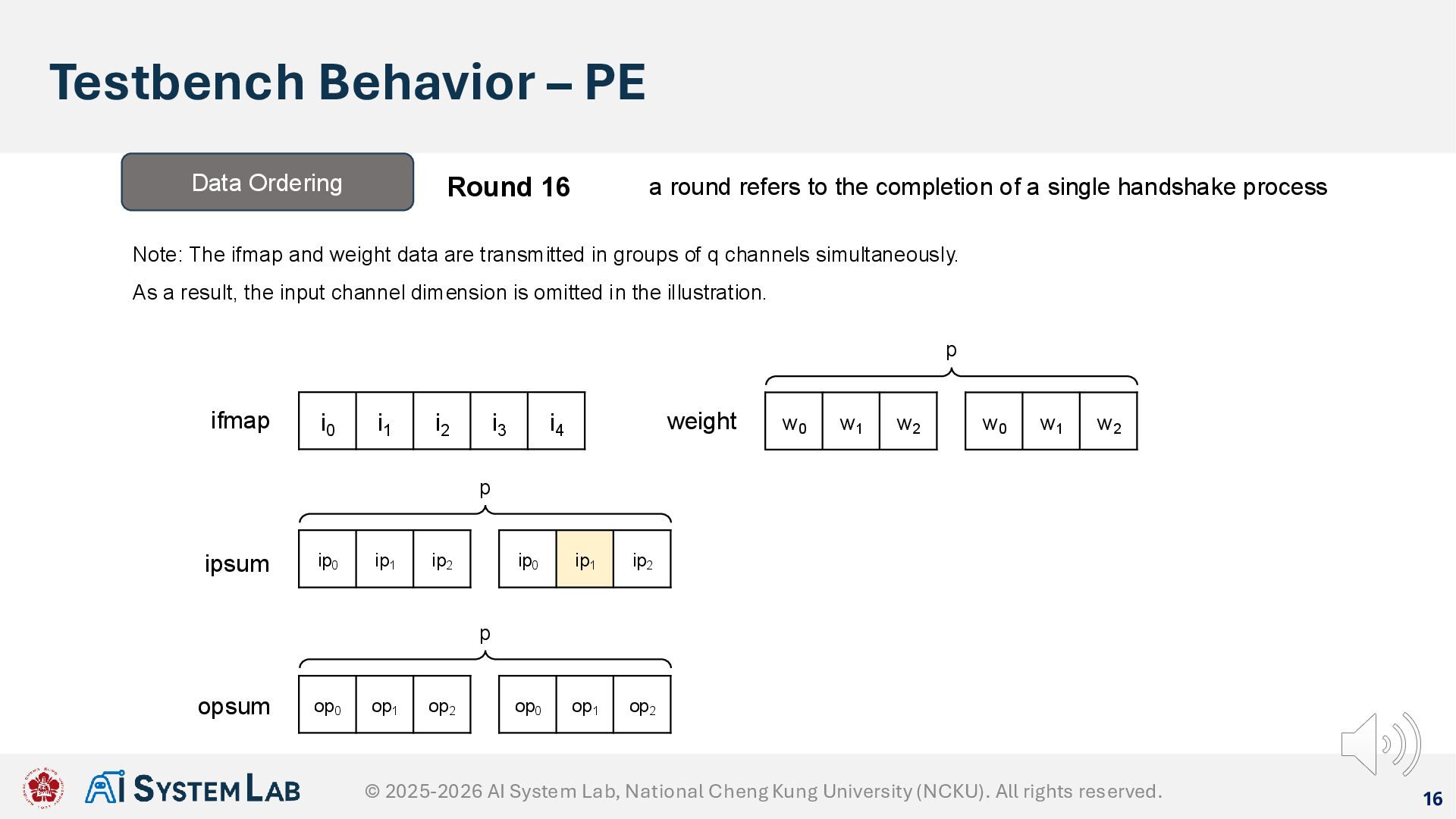 ifmap w0 w1 w2 weight ipsum Data Ordering Round 15 a round refers to the completion of a single handshake process Note: The ifmap and weight data are transmitted in groups of q channels simultaneously. As a result, the input channel dimension is omitted in the illustration. w0 w1 w2 p ip0 ip1 ip2 ip0 ip1 ip2 p op0 op1 op2 op0 op1 op2 p opsum © 2025-2026 AI System Lab, National Cheng Kung University (NCKU). All rights reserved.
