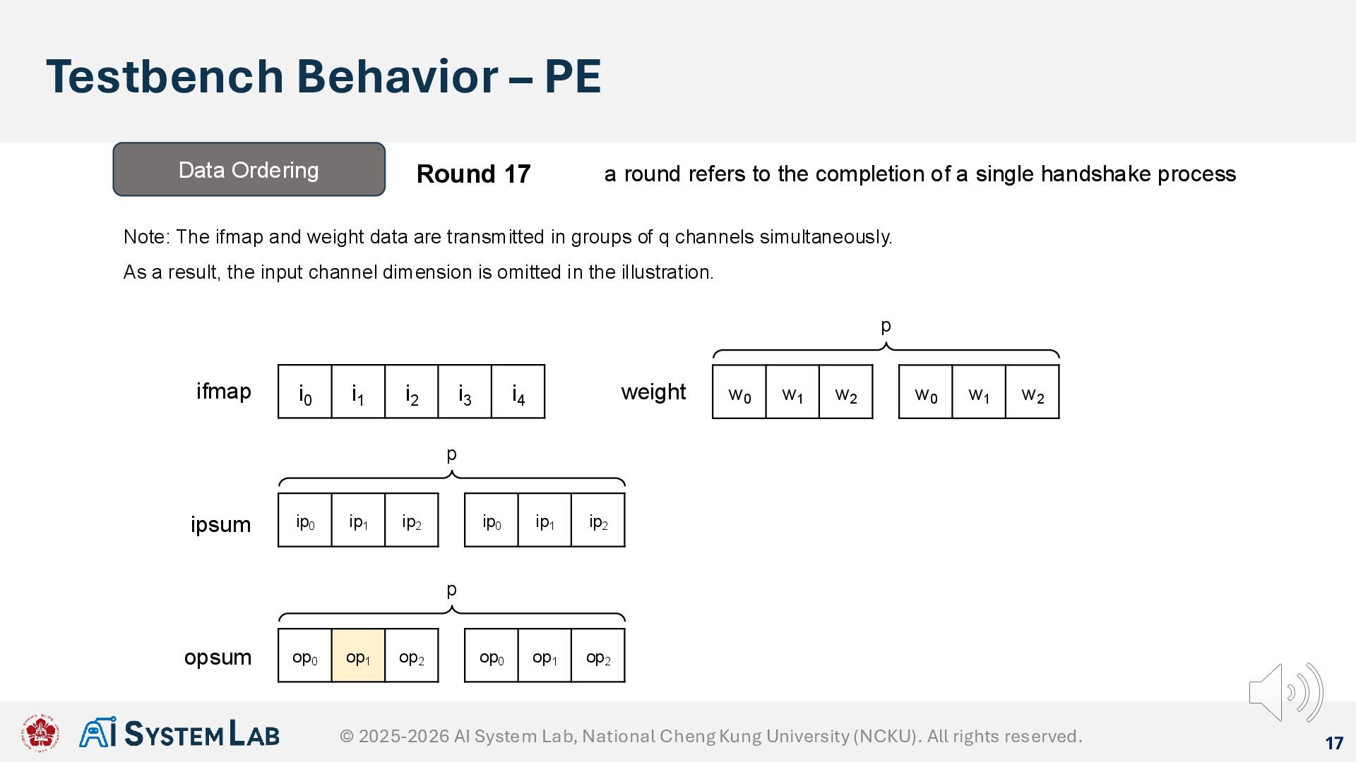 ifmap w0 w1 w2 weight ipsum Data Ordering Round 16 a round refers to the completion of a single handshake process Note: The ifmap and weight data are transmitted in groups of q channels simultaneously. As a result, the input channel dimension is omitted in the illustration. w0 w1 w2 p ip0 ip1 ip2 ip0 ip1 ip2 p op0 op1 op2 op0 op1 op2 p opsum © 2025-2026 AI System Lab, National Cheng Kung University (NCKU). All rights reserved.