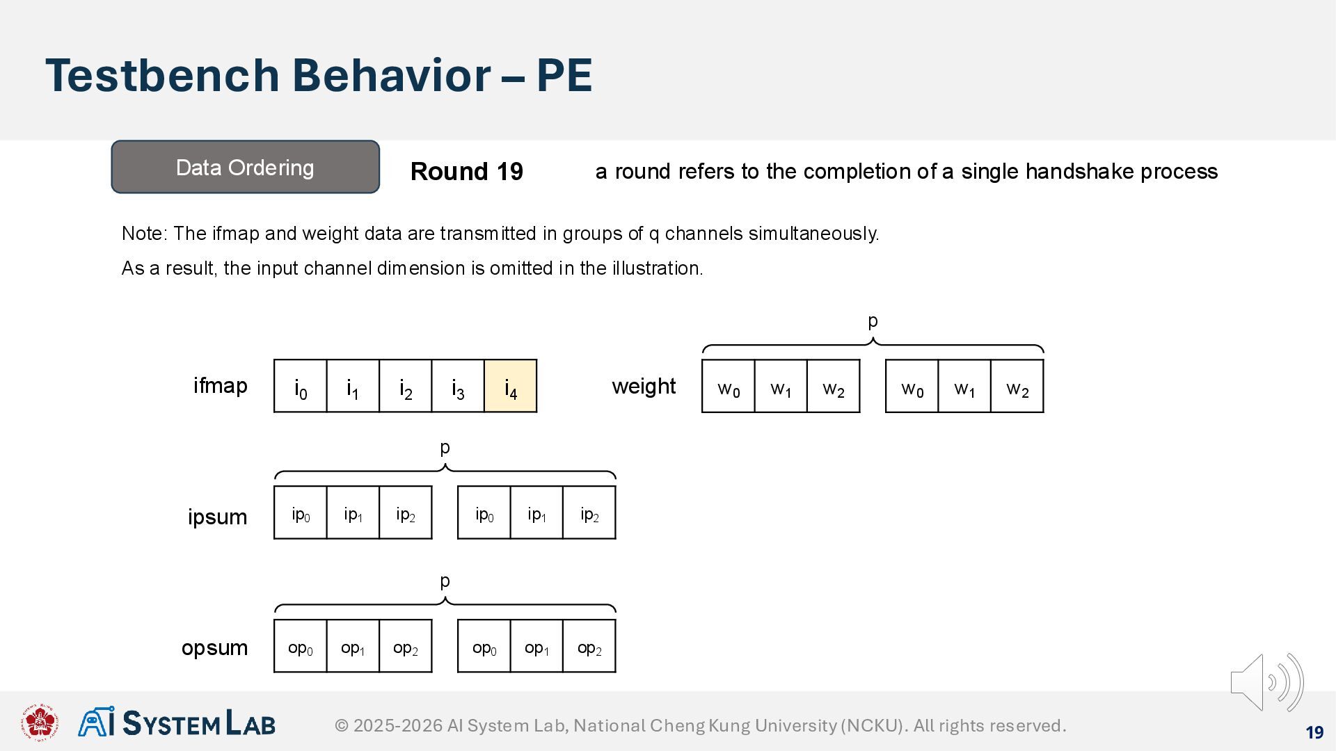 ifmap w0 w1 w2 weight ipsum Data Ordering Round 18 a round refers to the completion of a single handshake process Note: The ifmap and weight data are transmitted in groups of q channels simultaneously. As a result, the input channel dimension is omitted in the illustration. w0 w1 w2 p ip0 ip1 ip2 ip0 ip1 ip2 p op0 op1 op2 op0 op1 op2 p opsum © 2025-2026 AI System Lab, National Cheng Kung University (NCKU). All rights reserved.