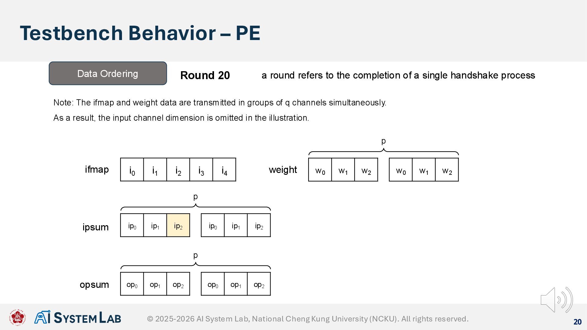 ifmap w0 w1 w2 weight ipsum Data Ordering Round 19 a round refers to the completion of a single handshake process Note: The ifmap and weight data are transmitted in groups of q channels simultaneously. As a result, the input channel dimension is omitted in the illustration. w0 w1 w2 p ip0 ip1 ip2 ip0 ip1 ip2 p op0 op1 op2 op0 op1 op2 p opsum © 2025-2026 AI System Lab, National Cheng Kung University (NCKU). All rights reserved.
