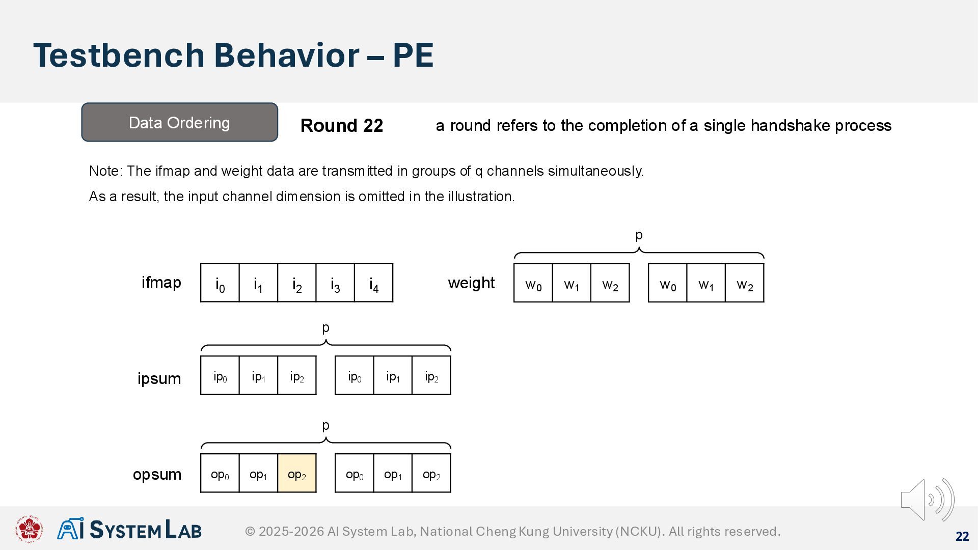 ifmap w0 w1 w2 weight ipsum Data Ordering Round 21 a round refers to the completion of a single handshake process Note: The ifmap and weight data are transmitted in groups of q channels simultaneously. As a result, the input channel dimension is omitted in the illustration. w0 w1 w2 p ip0 ip1 ip2 ip0 ip1 ip2 p op0 op1 op2 op0 op1 op2 p opsum © 2025-2026 AI System Lab, National Cheng Kung University (NCKU). All rights reserved.