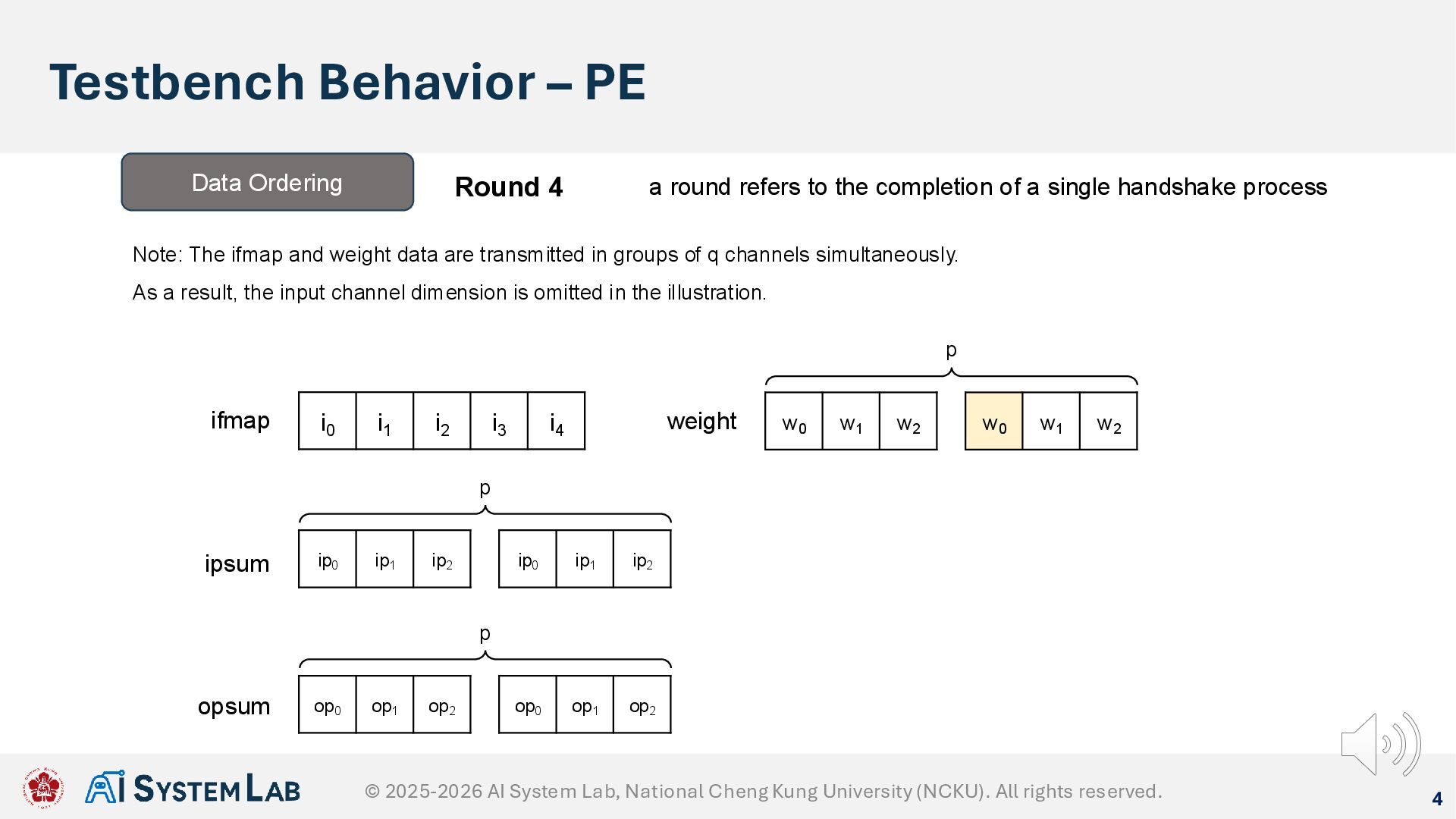 ifmap w0 w1 w2 weight ipsum Data Ordering Round 3 a round refers to the completion of a single handshake process Note: The ifmap and weight data are transmitted in groups of q channels simultaneously. As a result, the input channel dimension is omitted in the illustration. w0 w1 w2 p ip0 ip1 ip2 ip0 ip1 ip2 p op0 op1 op2 op0 op1 op2 p opsum © 2025-2026 AI System Lab, National Cheng Kung University (NCKU). All rights reserved.