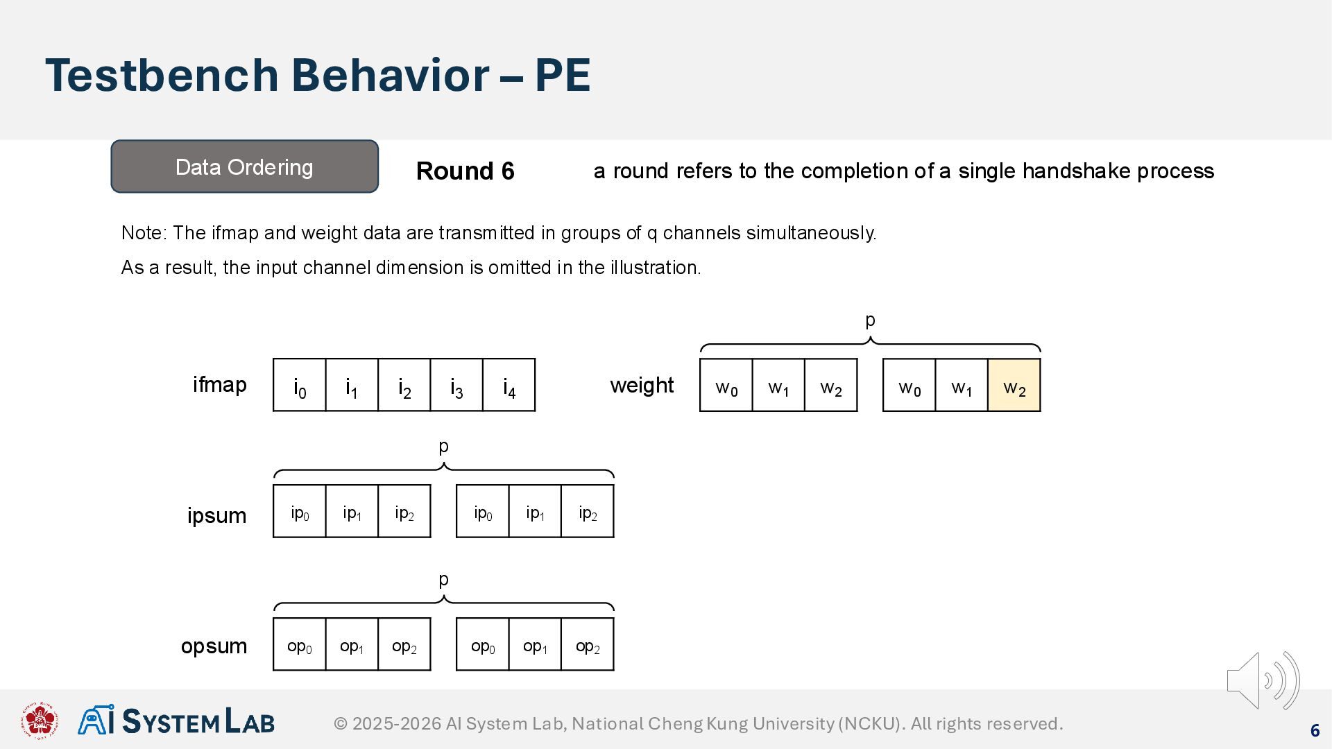 ifmap w0 w1 w2 weight ipsum Data Ordering Round 5 a round refers to the completion of a single handshake process Note: The ifmap and weight data are transmitted in groups of q channels simultaneously. As a result, the input channel dimension is omitted in the illustration. w0 w1 w2 p ip0 ip1 ip2 ip0 ip1 ip2 p op0 op1 op2 op0 op1 op2 p opsum © 2025-2026 AI System Lab, National Cheng Kung University (NCKU). All rights reserved.