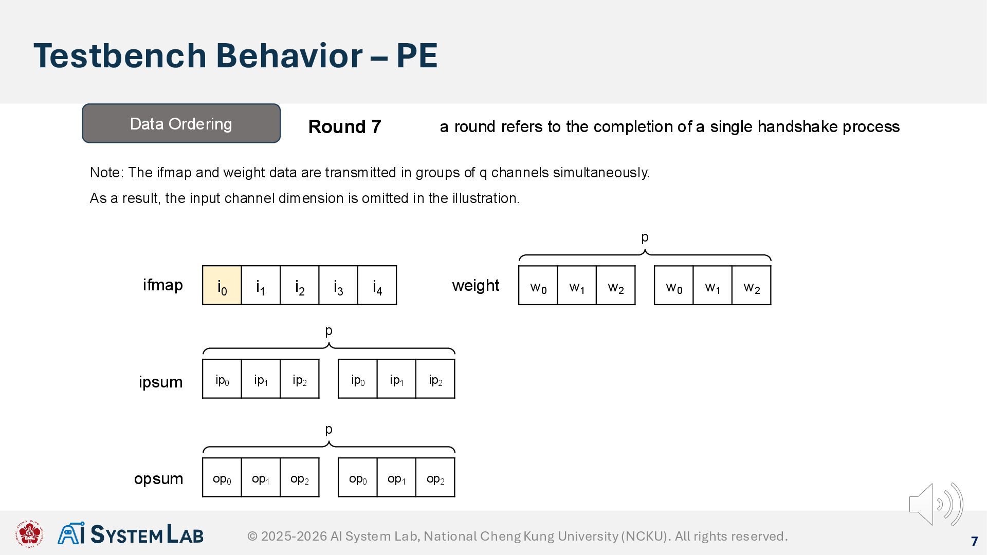 ifmap w0 w1 w2 weight ipsum Data Ordering Round 6 a round refers to the completion of a single handshake process Note: The ifmap and weight data are transmitted in groups of q channels simultaneously. As a result, the input channel dimension is omitted in the illustration. w0 w1 w2 p ip0 ip1 ip2 ip0 ip1 ip2 p op0 op1 op2 op0 op1 op2 p opsum © 2025-2026 AI System Lab, National Cheng Kung University (NCKU). All rights reserved.
