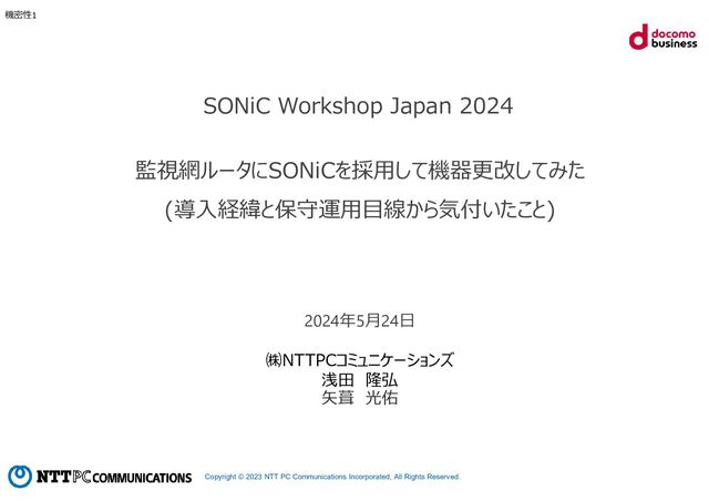 SONiC Workshop Japan 2024 https://sonic.connpass.com/event/313138/ 監視網ルータにSONiCを採用して機器更改してみた NTTPCコミュニケーションズ 浅田、矢葺