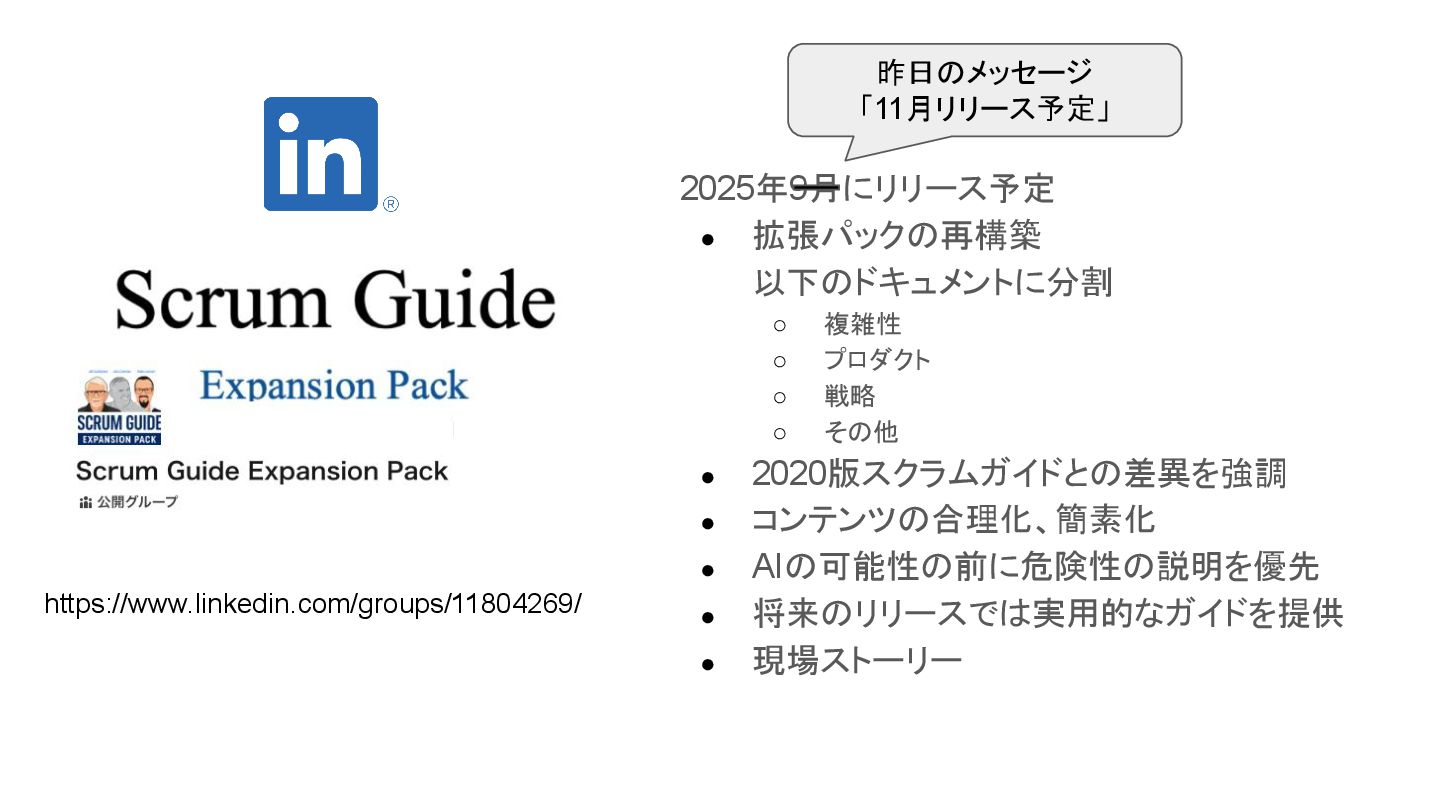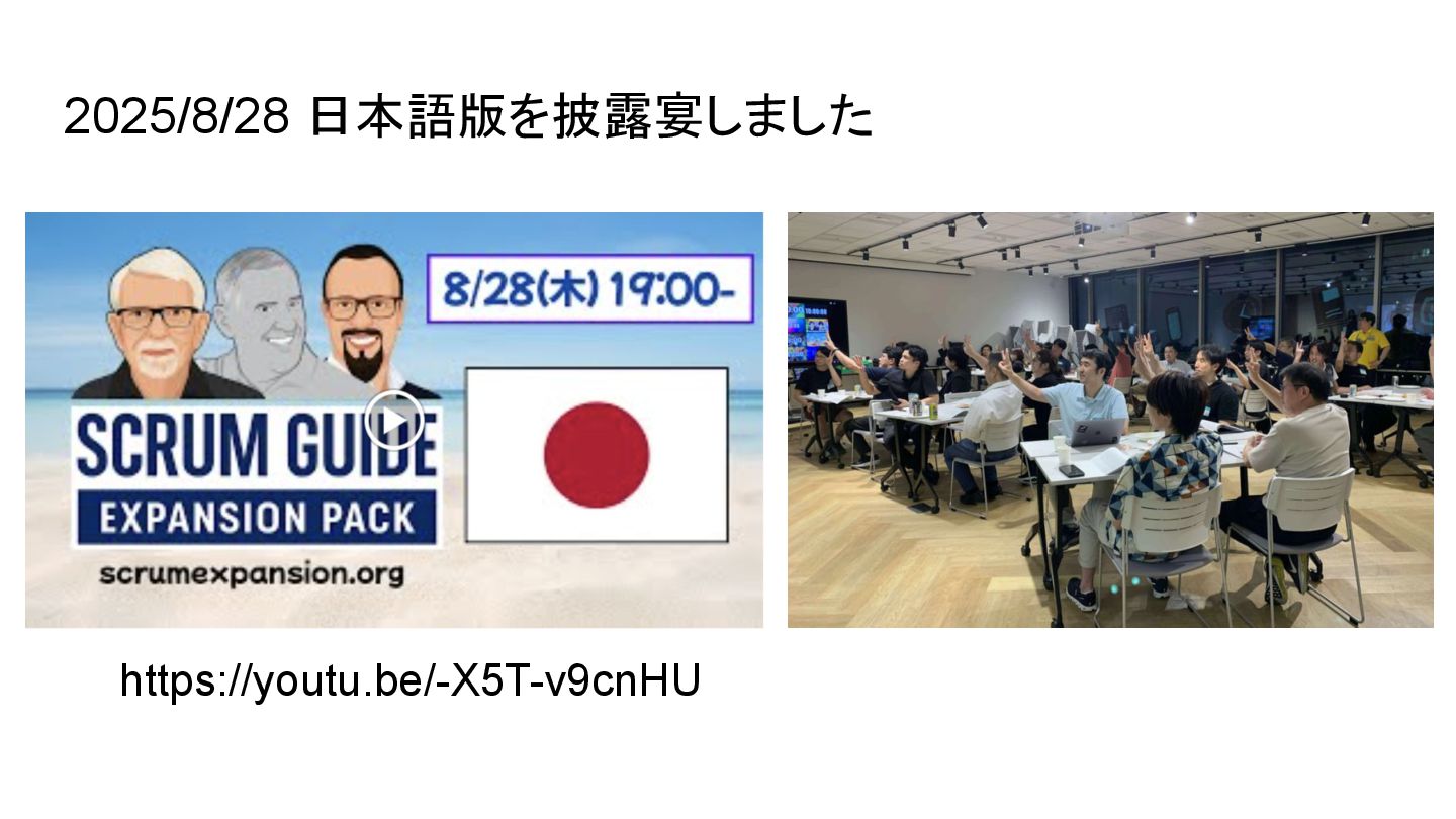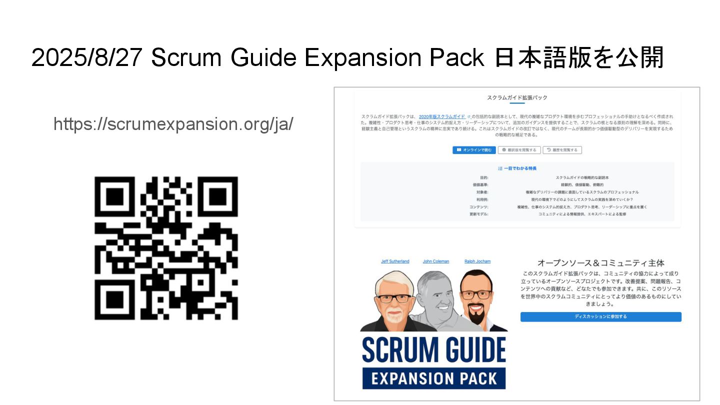 2025/8/27 Scrum Guide Expansion Pack 日本語版を公開 https://scrumexpansion.org/ja/