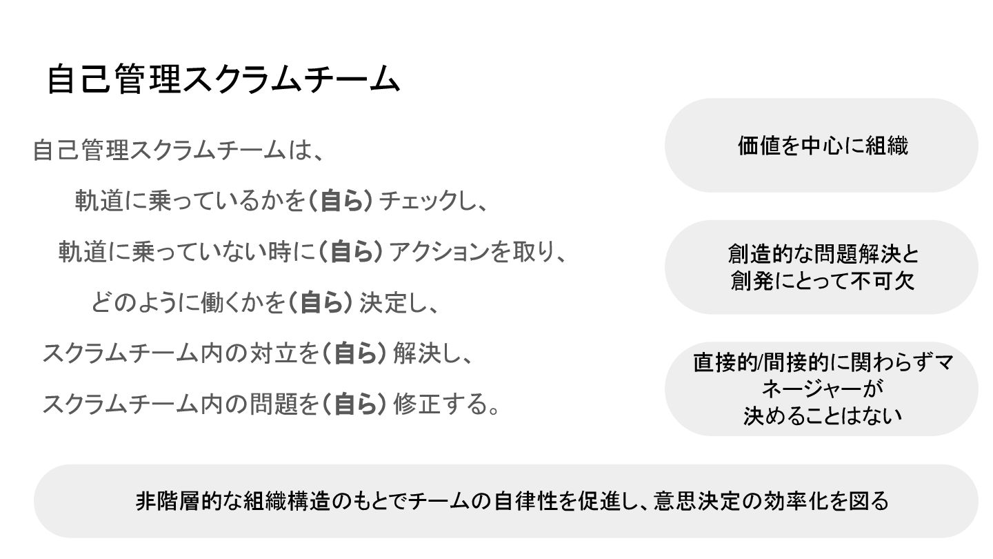 自己管理スクラムチーム 自己管理スクラムチームは、 軌道に乗っているかを(自ら)チェックし、 軌道に乗っていない時に(自ら)アクションを取り、 どのように働くかを(自ら)決定し、 スクラムチーム内の対立を(自ら)解決し、 スクラムチーム内の問題を(自ら)修正する。 価値を中心に組織 創造的な問題解決と