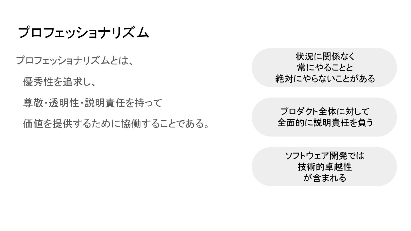 プロフェッショナリズム プロフェッショナリズムとは、 優秀性を追求し、 尊敬・透明性・説明責任を持って 価値を提供するために協働することである。 状況に関係なく 常にやることと 絶対にやらないことがある プロダクト全体に対して 全面的に説明責任を負う
