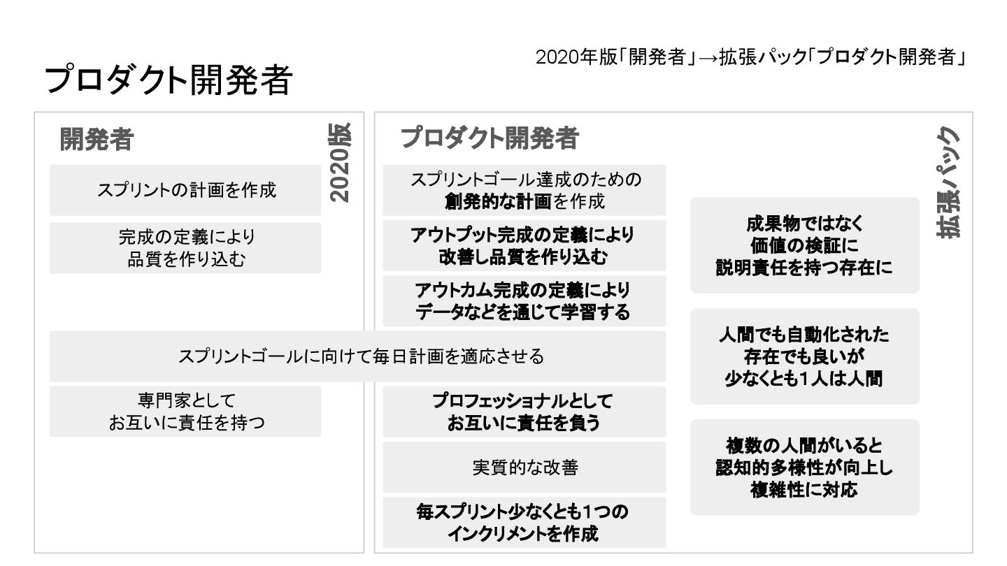 創発的な計画を作成 完成の定義により 品質を作り込む アウトプット完成の定義により 改善し品質を作り込む アウトカム完成の定義により データなどを通じて学習する スプリントゴールに向けて毎日計画を適応させる 専門家として お互いに責任を持つ プロフェッショナルとして お互いに責任を負う 実質的な改善 毎スプリント少なくとも1つの インクリメントを作成 成果物ではなく 価値の検証に 説明責任を持つ存在に 人間でも自動化された 存在でも良いが 少なくとも1人は人間 2020年版「開発者」→拡張パック「プロダクト開発者」