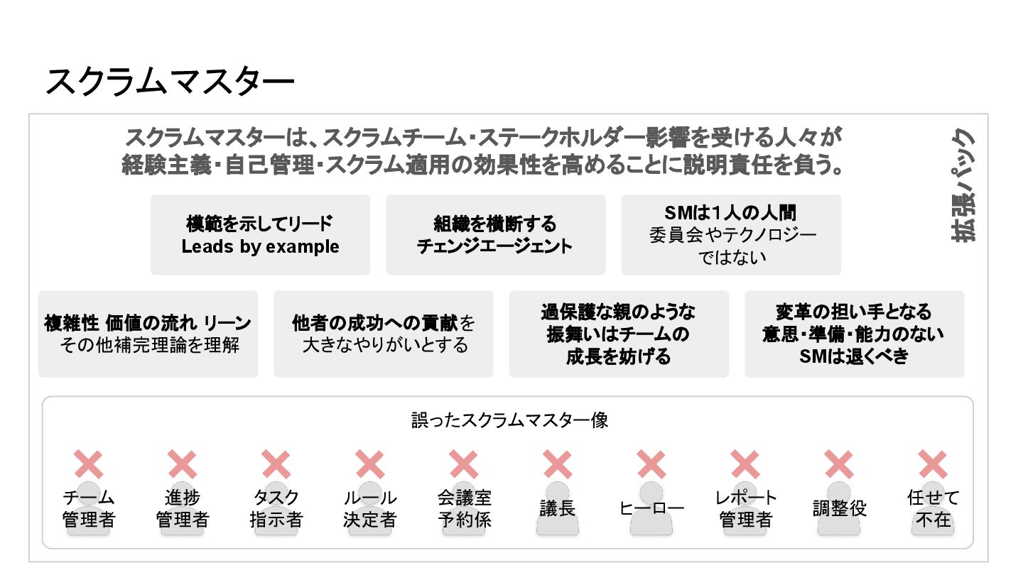 拡張パック スクラムマスター 模範を示してリード Leads by example 組織を横断する チェンジエージェント SMは1人の人間 委員会やテクノロジー