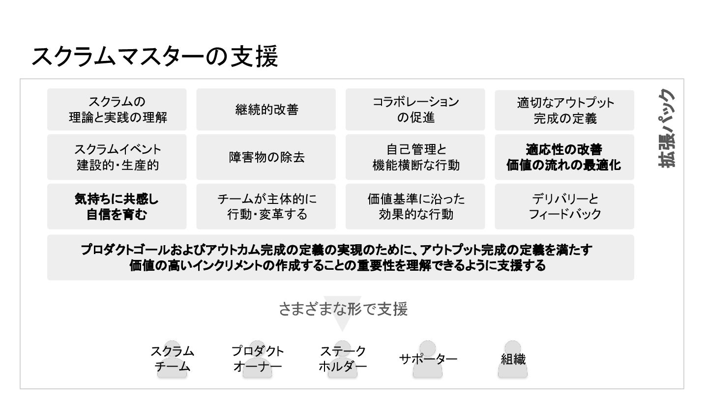 拡張パック スクラムマスターの支援 スクラムの 理論と実践の理解 継続的改善 コラボレーション の促進 適切なアウトプット 完成の定義 自己管理と