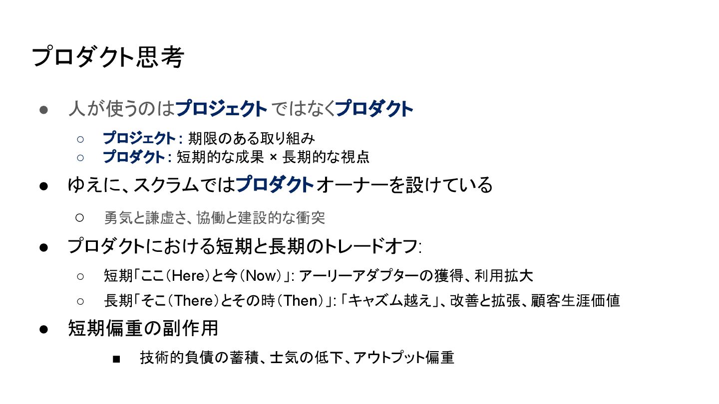短期的な成果 × 長期的な視点 • ゆえに、スクラムではプロダクト オーナーを設けている ◦ 勇気と謙虚さ、協働と建設的な衝突 • プロダクトにおける短期と長期のトレードオフ: ◦ 短期「ここ(Here)と今(Now)」: アーリーアダプターの獲得、利用拡大 ◦ 長期「そこ(There)とその時(Then)」: 「キャズム越え」、改善と拡張、顧客生涯価値 • 短期偏重の副作用 ▪ 技術的負債の蓄積、士気の低下、アウトプット偏重 プロダクト思考