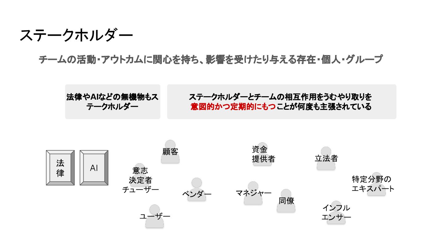 ステークホルダー 法律やAIなどの無機物もス テークホルダー ステークホルダーとチームの相互作用をうむやり取りを 意図的かつ定期的にもつことが何度も主張されている 顧客 ユーザー ベンダー インフル エンサー