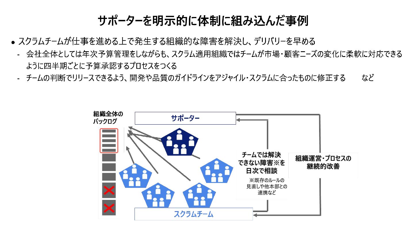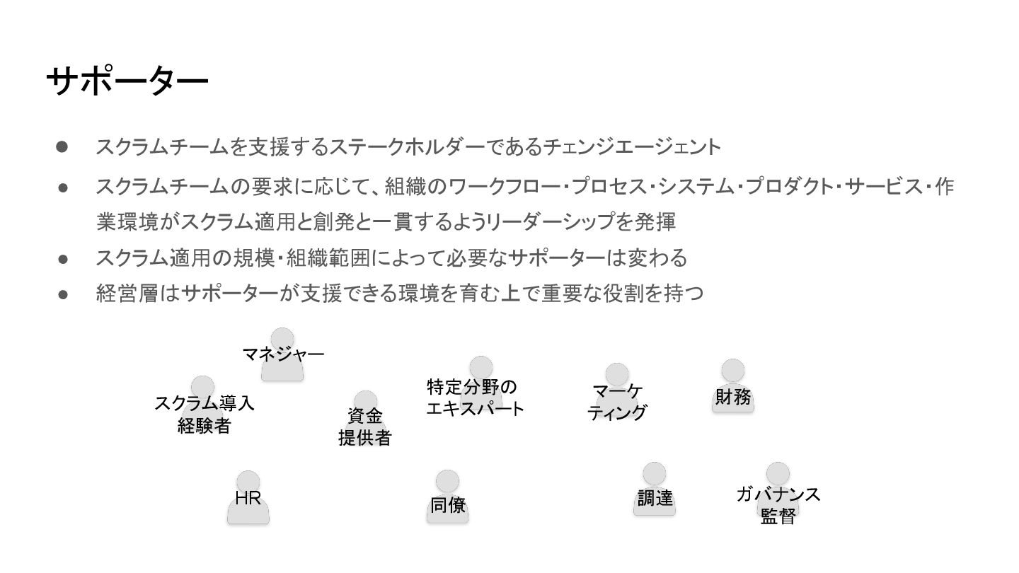 サポーター • スクラムチームを支援するステークホルダーであるチェンジエージェント • スクラムチームの要求に応じて、組織のワークフロー・プロセス・システム・プロダクト・サービス・作 業環境がスクラム適用と創発と一貫するようリーダーシップを発揮 • スクラム適用の規模・組織範囲によって必要なサポーターは変わる • 経営層はサポーターが支援できる環境を育む上で重要な役割を持つ