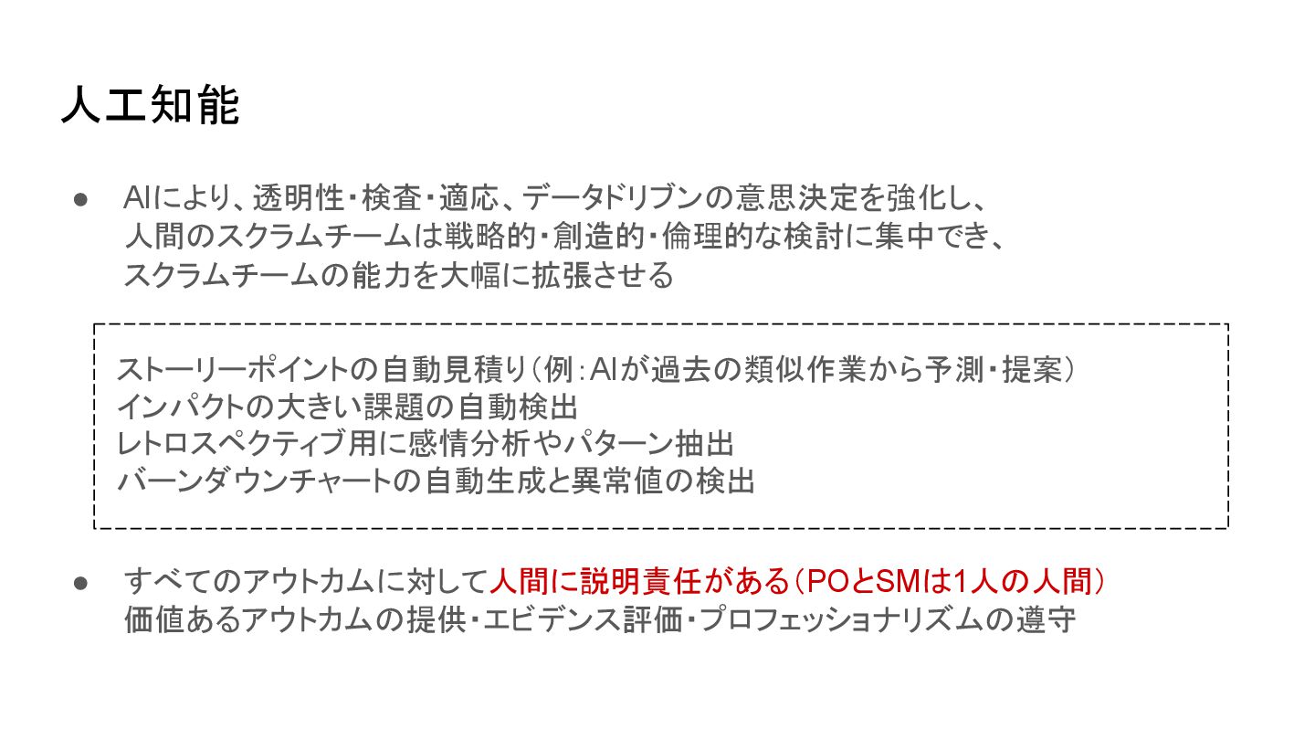 人工知能 • AIにより、透明性・検査・適応、データドリブンの意思決定を強化し、 人間のスクラムチームは戦略的・創造的・倫理的な検討に集中でき、 スクラムチームの能力を大幅に拡張させる • すべてのアウトカムに対して人間に説明責任がある(POとSMは1人の人間) 価値あるアウトカムの提供・エビデンス評価・プロフェッショナリズムの遵守 ストーリーポイントの自動見積り(例:AIが過去の類似作業から予測・提案) インパクトの大きい課題の自動検出