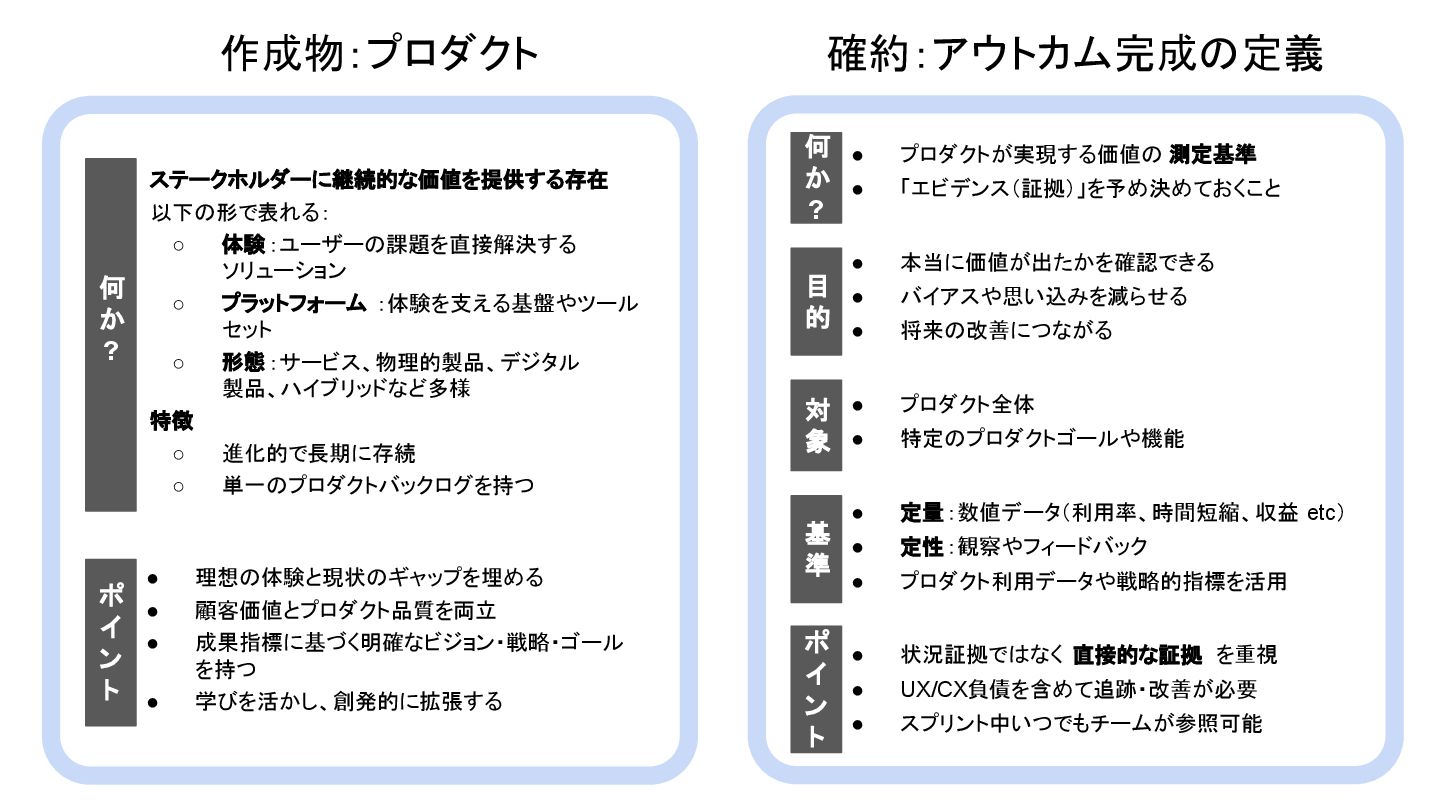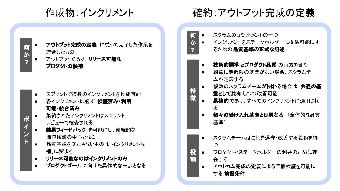 か ? 特 徴 役 割 • アウトプット完成の定義 に従って完了した作業を 統合したもの • アウトプットであり、 リリース可能な プロダクトの候補 • スプリントで複数のインクリメントを作成可能 • 各インクリメントは必ず 検証済み・利用 可能・統合済み • 集約されたインクリメントはスプリント レビューで検査される • 結果フィードバック を可能にし、継続的な 価値検証の中心となる • 品質基準を満たさないものは「インクリメント候 補」に留まる • リリース可能なのはインクリメントのみ • プロダクトゴールに向けた具体的な一歩となる • スクラムのコミットメントの一つ • インクリメントをステークホルダーに提供可能にす るための品質基準の正式な記述 • 技術的標準 とプロダクト品質 の両方を含む • 組織に最低限の基準がない場合、スクラムチー ムが定義する • 複数のスクラムチームが関わる場合は 共通の基 盤として共有 しつつ改善可能 • 累積的 であり、すべてのインクリメントに適用され る • 個々の受け入れ基準とは異なる (全体的な品質 基準) • スクラムチームはこれを遵守・改善する義務を持 つ • プロダクトとステークホルダーの利益のために存 在する • アウトカム完成の定義による価値検証を可能に する 前提条件