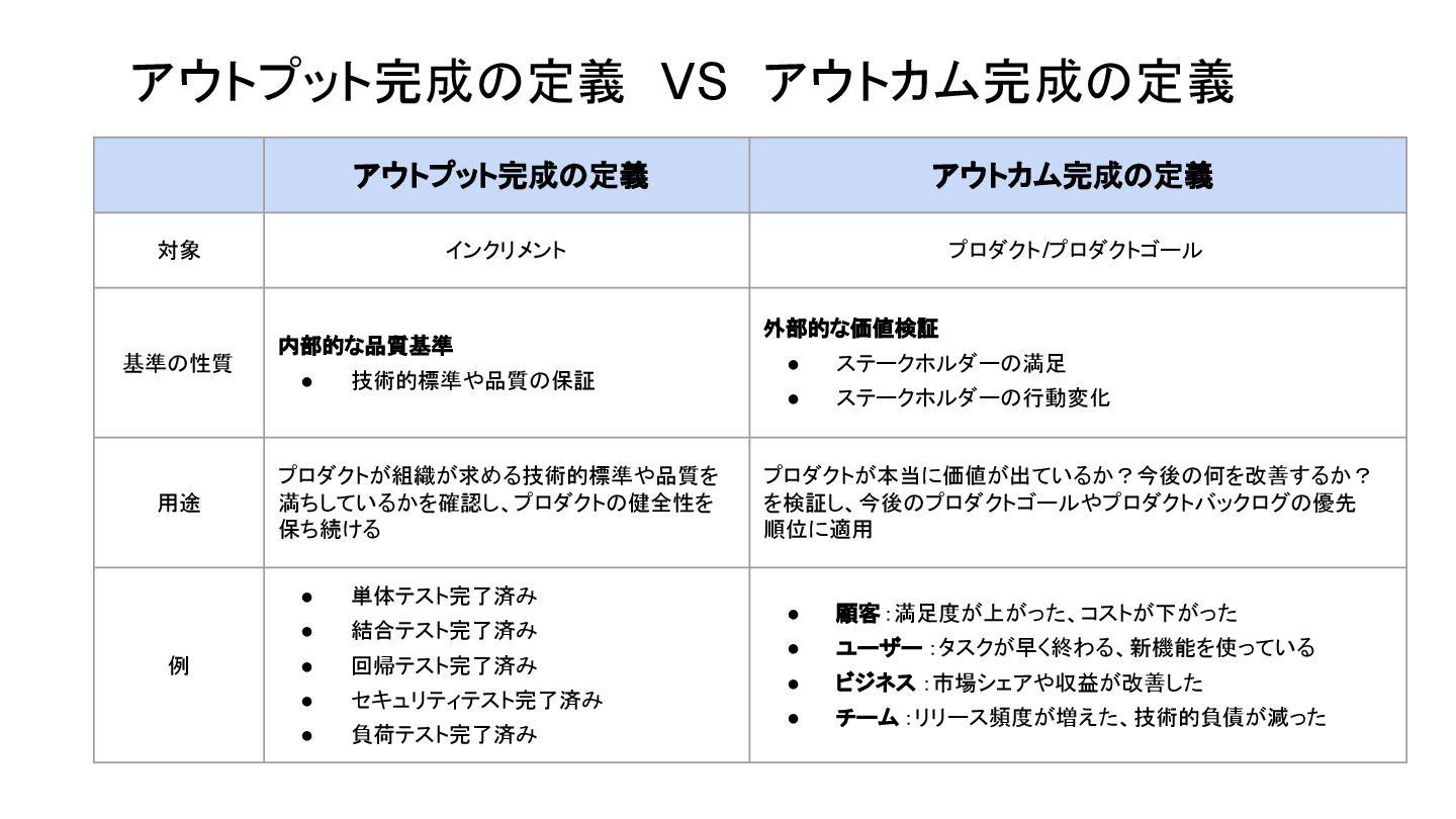 アウトプット完成の定義 VS アウトカム完成の定義 アウトプット完成の定義 アウトカム完成の定義 対象 インクリメント プロダクト/プロダクトゴール 基準の性質 内部的な品質基準 • 技術的標準や品質の保証