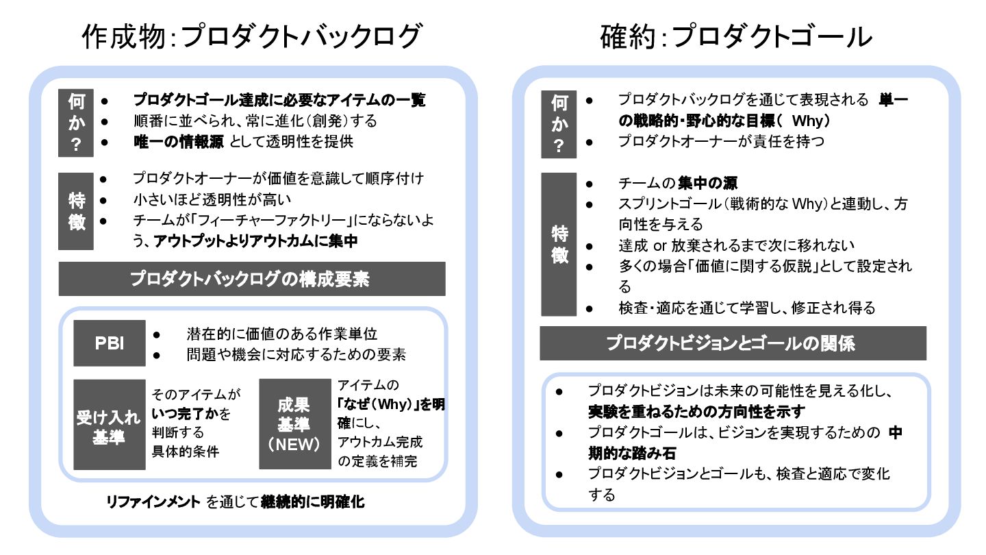 特 徴 • プロダクトゴール達成に必要なアイテムの一覧 • 順番に並べられ、常に進化(創発)する • 唯一の情報源 として透明性を提供 • プロダクトオーナーが価値を意識して順序付け • 小さいほど透明性が高い • チームが「フィーチャーファクトリー」にならないよ う、アウトプットよりアウトカムに集中 プロダクトバックログの構成要素 PBI 受け入れ 基準 成果 基準 (NEW) • 潜在的に価値のある作業単位 • 問題や機会に対応するための要素 そのアイテムが いつ完了かを 判断する 具体的条件 アイテムの 「なぜ(Why)」を明 確にし、 アウトカム完成 の定義を補完 リファインメント を通じて継続的に明確化 • プロダクトバックログを通じて表現される 単一 の戦略的・野心的な目標( Why) • プロダクトオーナーが責任を持つ • チームの集中の源 • スプリントゴール(戦術的な Why)と連動し、方 向性を与える • 達成 or 放棄されるまで次に移れない • 多くの場合「価値に関する仮説」として設定され る • 検査・適応を通じて学習し、修正され得る プロダクトビジョンとゴールの関係 • プロダクトビジョンは未来の可能性を見える化し、 実験を重ねるための方向性を示す • プロダクトゴールは、ビジョンを実現するための 中 期的な踏み石 • プロダクトビジョンとゴールも、検査と適応で変化 する