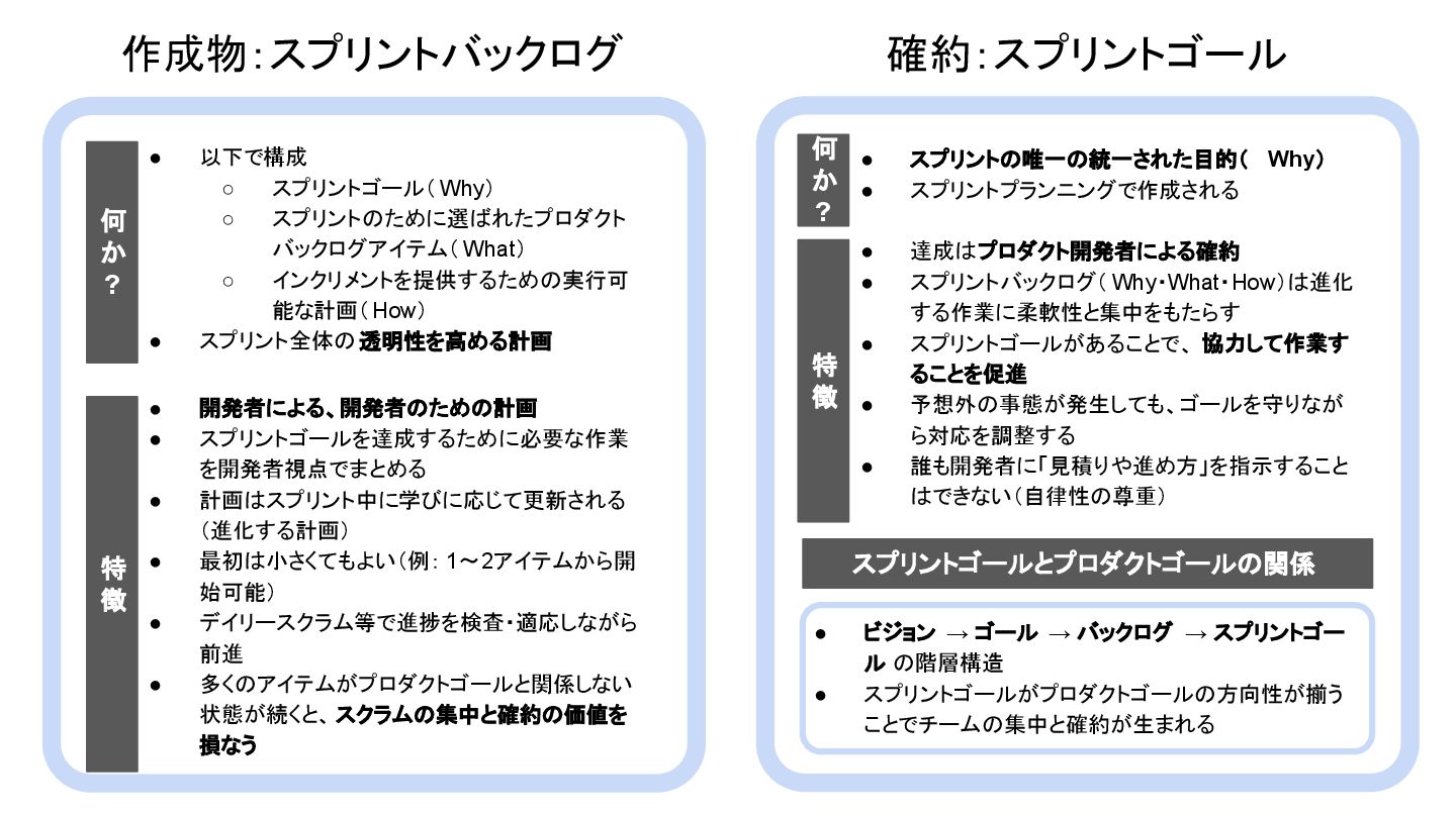 特 徴 • スプリントの唯一の統一された目的( Why) • スプリントプランニングで作成される • 達成はプロダクト開発者による確約 • スプリントバックログ( Why・What・How)は進化 する作業に柔軟性と集中をもたらす • スプリントゴールがあることで、 協力して作業す ることを促進 • 予想外の事態が発生しても、ゴールを守りなが ら対応を調整する • 誰も開発者に「見積りや進め方」を指示すること はできない(自律性の尊重) • 以下で構成 ◦ スプリントゴール( Why) ◦ スプリントのために選ばれたプロダクト バックログアイテム( What) ◦ インクリメントを提供するための実行可 能な計画(How) • スプリント全体の 透明性を高める計画 • 開発者による、開発者のための計画 • スプリントゴールを達成するために必要な作業 を開発者視点でまとめる • 計画はスプリント中に学びに応じて更新される (進化する計画) • 最初は小さくてもよい(例: 1〜2アイテムから開 始可能) • デイリースクラム等で進捗を検査・適応しながら 前進 • 多くのアイテムがプロダクトゴールと関係しない 状態が続くと、スクラムの集中と確約の価値を 損なう スプリントゴールとプロダクトゴールの関係 • ビジョン → ゴール → バックログ → スプリントゴー ル の階層構造 • スプリントゴールがプロダクトゴールの方向性が揃う ことでチームの集中と確約が生まれる