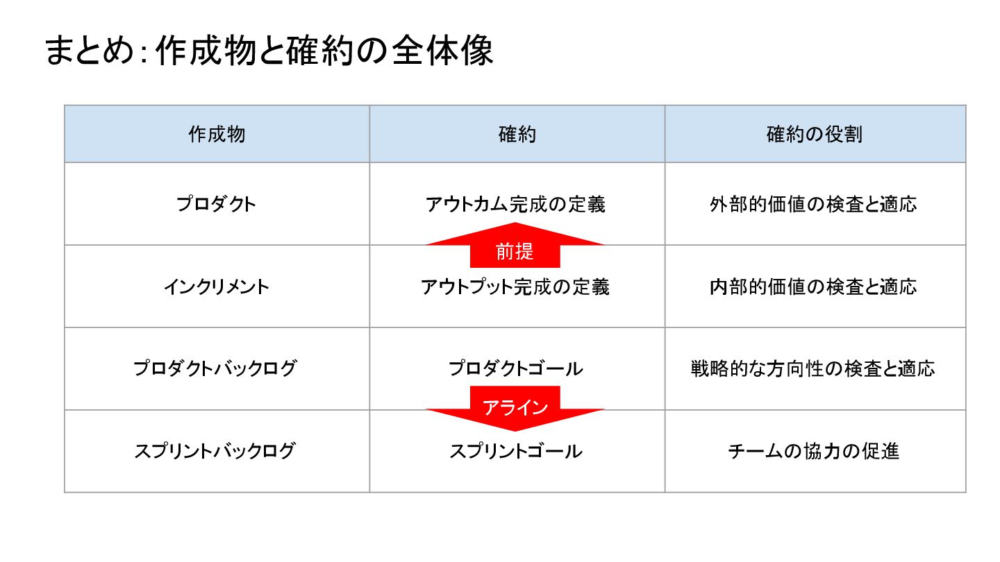 まとめ:作成物と確約の全体像 作成物 確約 確約の役割 プロダクト アウトカム完成の定義 外部的価値の検査と適応 インクリメント アウトプット完成の定義 内部的価値の検査と適応