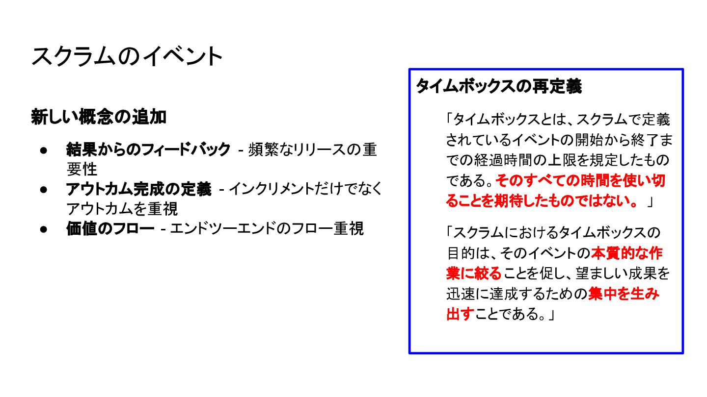 インクリメントだけでなく アウトカムを重視 • 価値のフロー - エンドツーエンドのフロー重視 タイムボックスの再定義 「タイムボックスとは、スクラムで定義 されているイベントの開始から終了ま での経過時間の上限を規定したもの である。そのすべての時間を使い切 ることを期待したものではない。 」 「スクラムにおけるタイムボックスの 目的は、そのイベントの本質的な作 業に絞ることを促し、望ましい成果を 迅速に達成するための集中を生み 出すことである。」