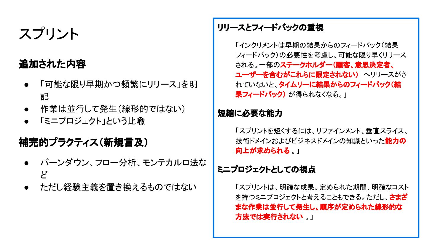 • バーンダウン、フロー分析、モンテカルロ法な ど • ただし経験主義を置き換えるものではない リリースとフィードバックの重視 「インクリメントは早期の結果からのフィードバック(結果 フィードバック)の必要性を考慮し、可能な限り早くリリース される。一部のステークホルダー(顧客、意思決定者、 ユーザーを含むがこれらに限定されない) へリリースがさ れていないと、タイムリーに結果からのフィードバック(結 果フィードバック) が得られなくなる。」 短縮に必要な能力 「スプリントを短くするには、リファインメント、垂直スライス、 技術ドメインおよびビジネスドメインの知識といった能力の 向上が求められる 。」 ミニプロジェクトとしての視点 「スプリントは、明確な成果、定められた期間、明確なコスト を持つミニプロジェクトと考えることもできる。ただし、さまざ まな作業は並行して発生し、順序が定められた線形的な 方法では実行されない 。」