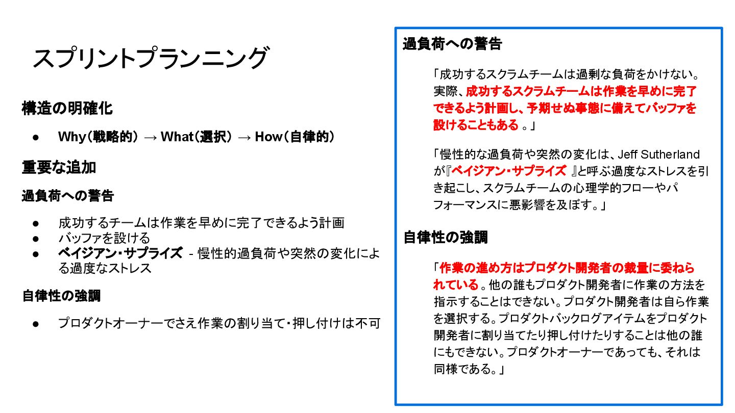 • 成功するチームは作業を早めに完了できるよう計画 • バッファを設ける • ベイジアン・サプライズ - 慢性的過負荷や突然の変化によ る過度なストレス 自律性の強調 • プロダクトオーナーでさえ作業の割り当て・押し付けは不可 過負荷への警告 「成功するスクラムチームは過剰な負荷をかけない。 実際、成功するスクラムチームは作業を早めに完了 できるよう計画し、予期せぬ事態に備えてバッファを 設けることもある 。」 「慢性的な過負荷や突然の変化は、Jeff Sutherland が『ベイジアン・サプライズ 』と呼ぶ過度なストレスを引 き起こし、スクラムチームの心理学的フローやパ フォーマンスに悪影響を及ぼす。」 自律性の強調 「作業の進め方はプロダクト開発者の裁量に委ねら れている。他の誰もプロダクト開発者に作業の方法を 指示することはできない。プロダクト開発者は自ら作業 を選択する。プロダクトバックログアイテムをプロダクト 開発者に割り当てたり押し付けたりすることは他の誰 にもできない。プロダクトオーナーであっても、それは 同様である。」