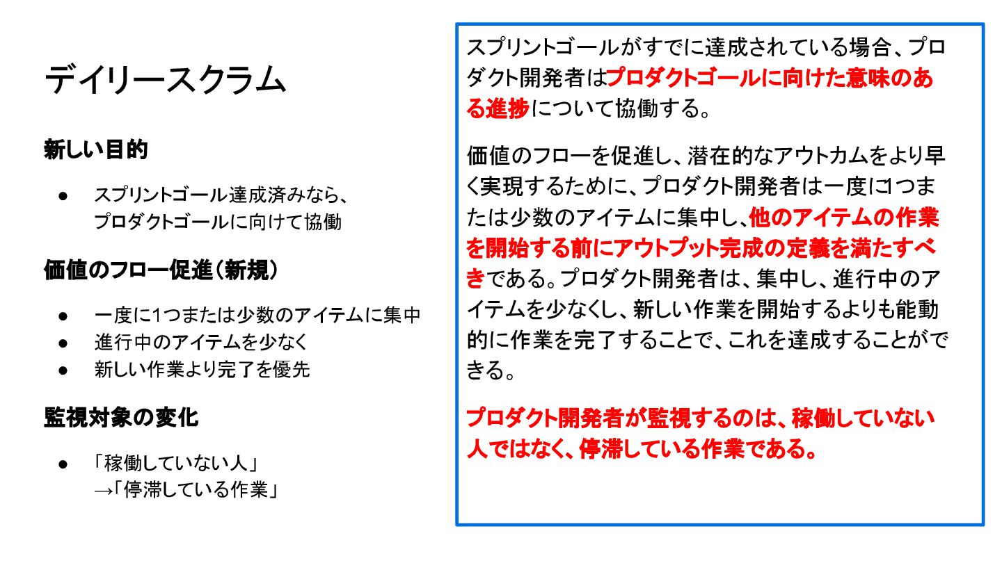 • 新しい作業より完了を優先 監視対象の変化 • 「稼働していない人」 →「停滞している作業」 スプリントゴールがすでに達成されている場合、プロ ダクト開発者はプロダクトゴールに向けた意味のあ る進捗について協働する。 価値のフローを促進し、潜在的なアウトカムをより早 く実現するために、プロダクト開発者は一度に 1つま たは少数のアイテムに集中し、他のアイテムの作業 を開始する前にアウトプット完成の定義を満たすべ きである。プロダクト開発者は、集中し、進行中のア イテムを少なくし、新しい作業を開始するよりも能動 的に作業を完了することで、これを達成することがで きる。 プロダクト開発者が監視するのは、稼働していない 人ではなく、停滞している作業である。