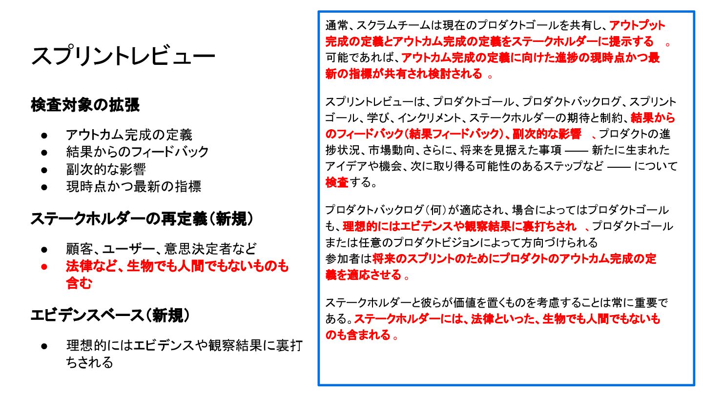 ステークホルダーの再定義(新規) • 顧客、ユーザー、意思決定者など • 法律など、生物でも人間でもないものも 含む エビデンスベース(新規) • 理想的にはエビデンスや観察結果に裏打 ちされる 通常、スクラムチームは現在のプロダクトゴールを共有し、アウトプット 完成の定義とアウトカム完成の定義をステークホルダーに提示する 。 可能であれば、アウトカム完成の定義に向けた進捗の現時点かつ最 新の指標が共有され検討される 。 スプリントレビューは、プロダクトゴール、プロダクトバックログ、スプリント ゴール、学び、インクリメント、ステークホルダーの期待と制約、結果から のフィードバック(結果フィードバック)、副次的な影響 、プロダクトの進 捗状況、市場動向、さらに、将来を見据えた事項 —— 新たに生まれた アイデアや機会、次に取り得る可能性のあるステップなど —— について 検査する。 プロダクトバックログ(何)が適応され、場合によってはプロダクトゴール も、理想的にはエビデンスや観察結果に裏打ちされ 、プロダクトゴール または任意のプロダクトビジョンによって方向づけられる 参加者は将来のスプリントのためにプロダクトのアウトカム完成の定 義を適応させる 。 ステークホルダーと彼らが価値を置くものを考慮することは常に重要で ある。ステークホルダーには、法律といった、生物でも人間でもないも のも含まれる 。