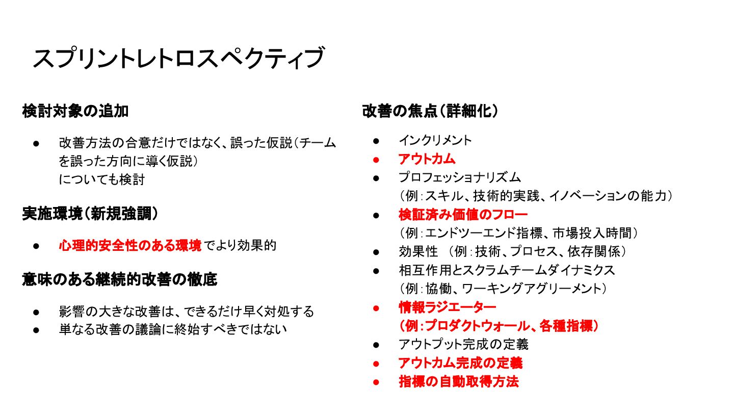 (例:エンドツーエンド指標、市場投入時間) • 効果性 (例:技術、プロセス、依存関係) • 相互作用とスクラムチームダイナミクス (例:協働、ワーキングアグリーメント) • 情報ラジエーター (例:プロダクトウォール、各種指標) • アウトプット完成の定義 • アウトカム完成の定義 • 指標の自動取得方法 スプリントレトロスペクティブ 検討対象の追加 • 改善方法の合意だけではなく、誤った仮説(チーム を誤った方向に導く仮説) についても検討 実施環境(新規強調) • 心理的安全性のある環境でより効果的 意味のある継続的改善の徹底 • 影響の大きな改善は、できるだけ早く対処する • 単なる改善の議論に終始すべきではない