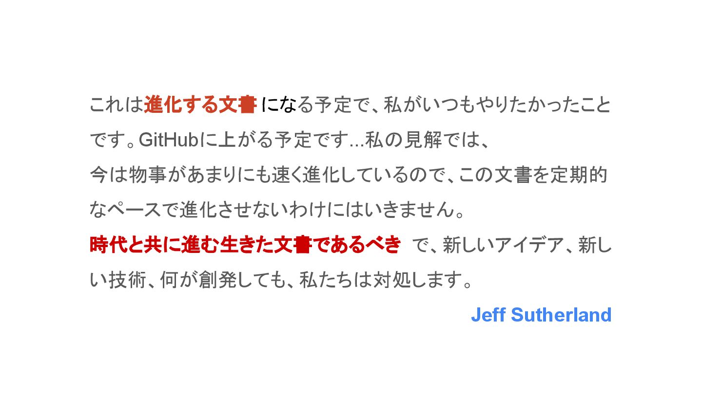 これは進化する文書 になる予定で、私がいつもやりたかったこと です。GitHubに上がる予定です...私の見解では、 今は物事があまりにも速く進化しているので、この文書を定期的 なペースで進化させないわけにはいきません。 時代と共に進む生きた文書であるべき で、新しいアイデア、新し い技術、何が創発しても、私たちは対処します。 Jeff Sutherland
