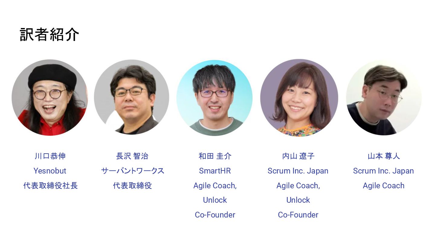 山本 尊人 Scrum Inc. Japan Agile Coach 川口恭伸 Yesnobut 代表取締役社長 長沢 智治 サーバントワークス 代表取締役 和田 圭介 SmartHR Agile Coach, Unlock Co-Founder