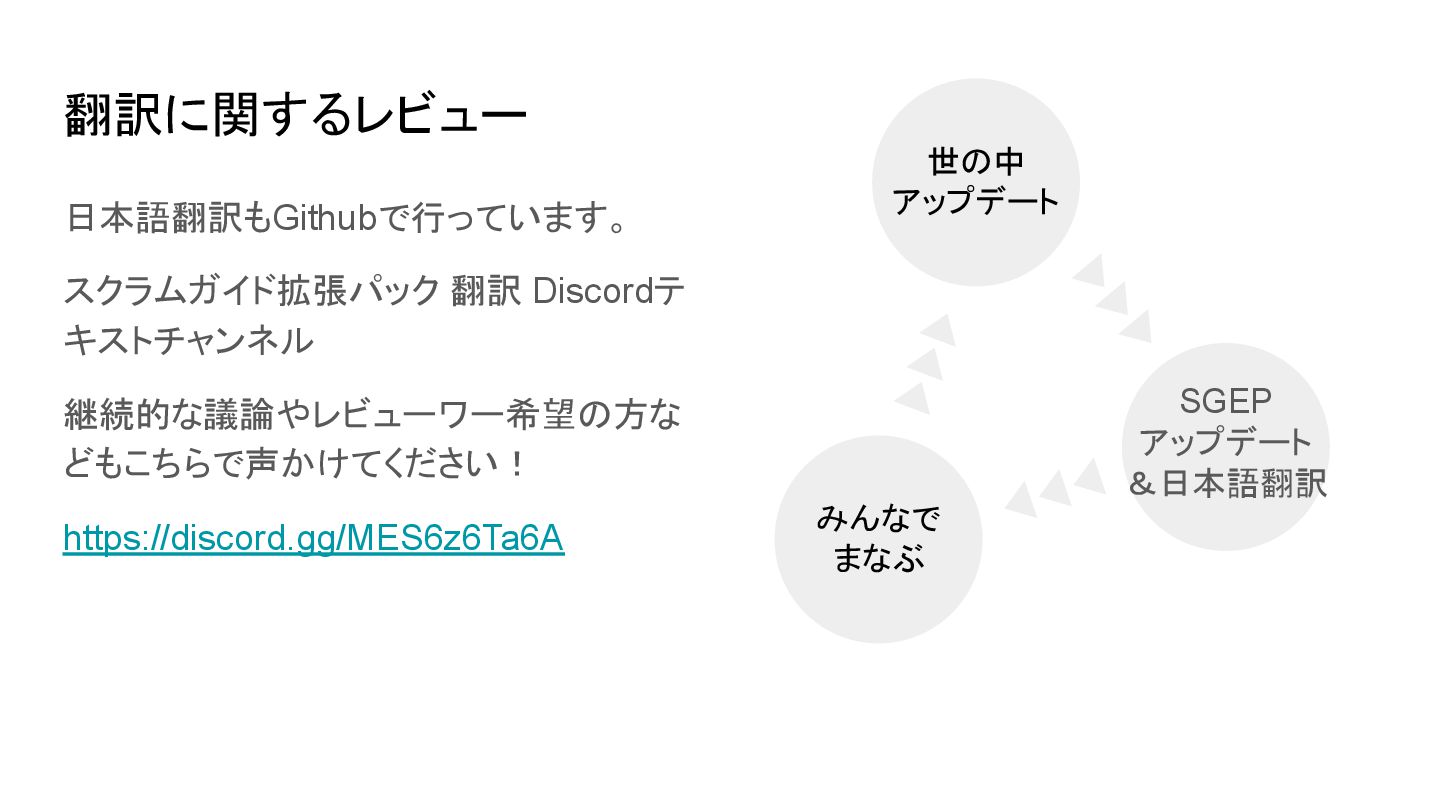 翻訳に関するレビュー 日本語翻訳もGithubで行っています。 スクラムガイド拡張パック 翻訳 Discordテ キストチャンネル 継続的な議論やレビューワー希望の方な どもこちらで声かけてください! https://discord.gg/MES6z6Ta6A SGEP