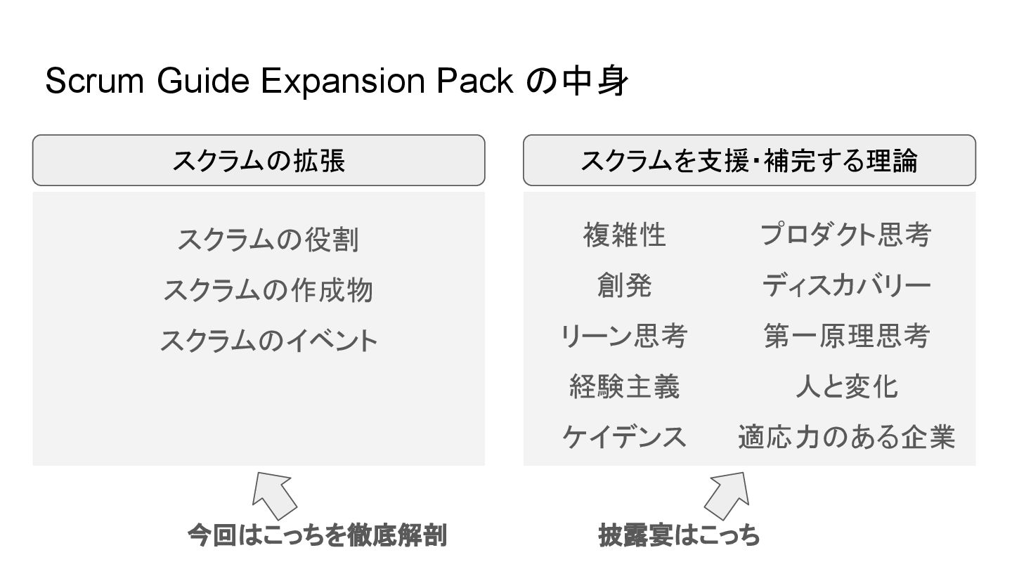スクラムの拡張 スクラムの役割 スクラムの作成物 スクラムのイベント スクラムを支援・補完する理論 プロダクト思考 ディスカバリー 第一原理思考 人と変化 適応力のある企業 披露宴はこっち 今回はこっちを徹底解剖