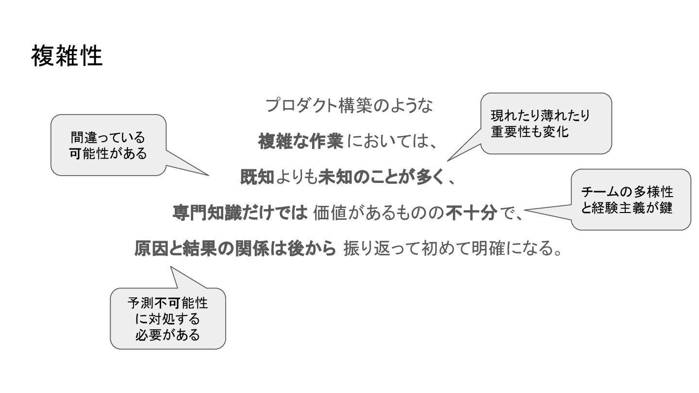 複雑性 プロダクト構築のような 複雑な作業 においては、 既知よりも未知のことが多く 、 専門知識だけでは 価値があるものの不十分で、 原因と結果の関係は後から 振り返って初めて明確になる。