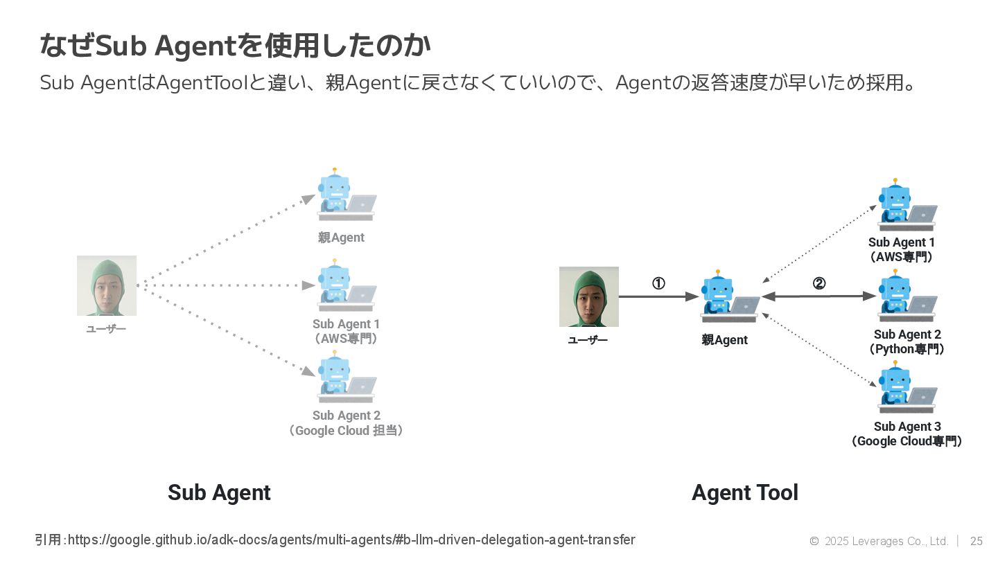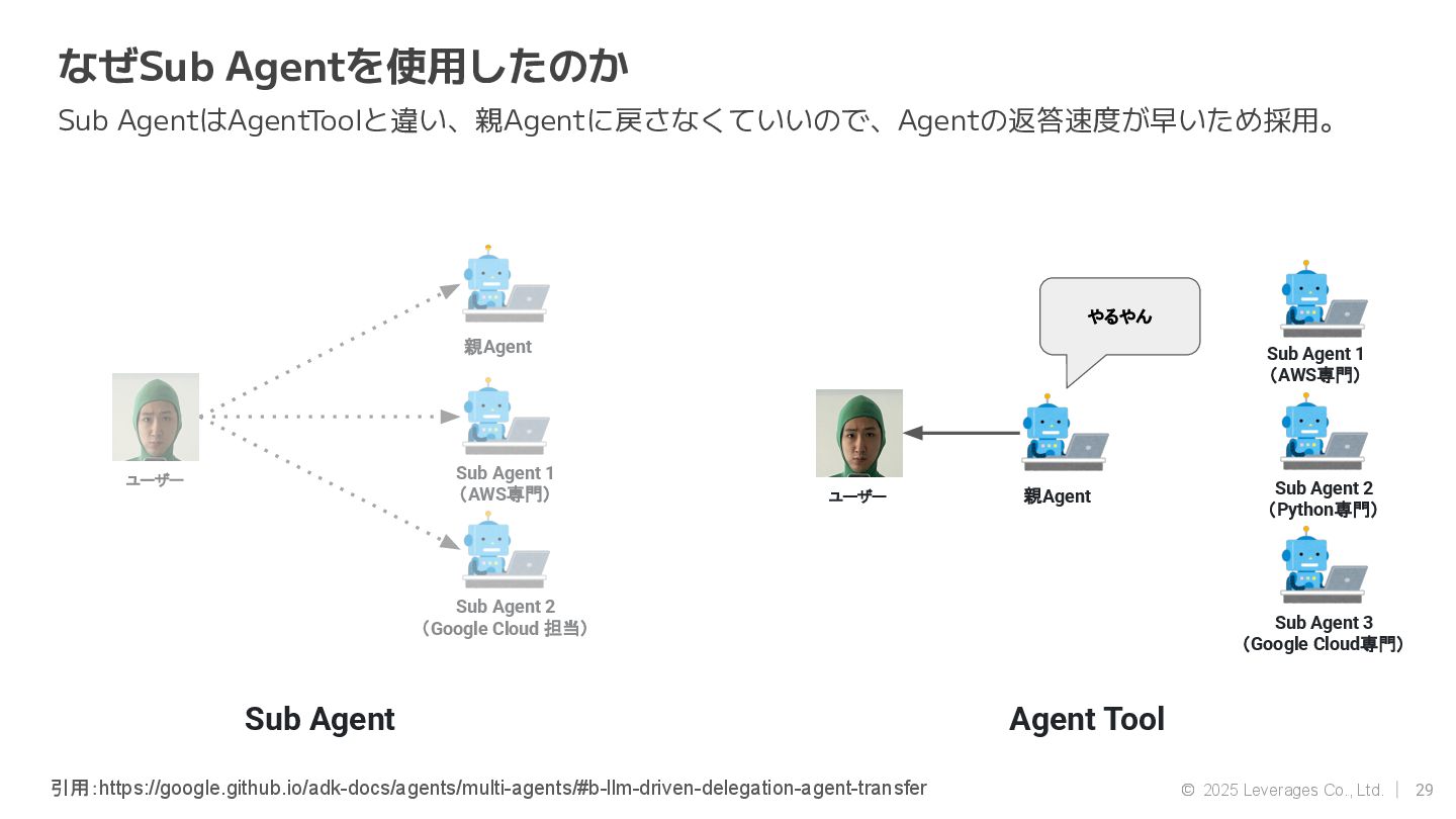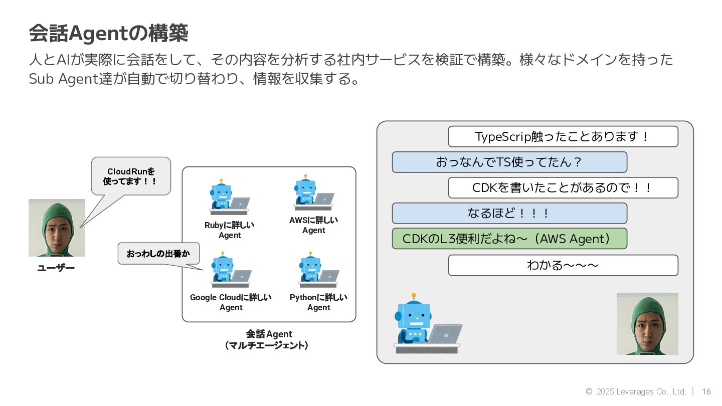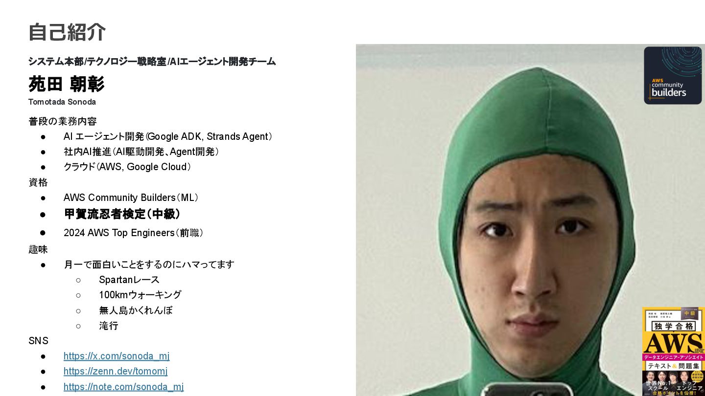 AI エージェント開発(Google ADK, Strands Agent) • 社内AI推進(AI駆動開発、Agent開発) • クラウド(AWS, Google Cloud) 資格 • AWS Community Builders(ML) • 甲賀流忍者検定(中級) • 2024 AWS Top Engineers(前職) 趣味 • 月一で面白いことをするのにハマってます ◦ Spartanレース ◦ 100kmウォーキング ◦ 無人島かくれんぼ ◦ 滝行 SNS • https://x.com/sonoda_mj • https://zenn.dev/tomomj • https://note.com/sonoda_mj Tomotada Sonoda システム本部/テクノロジー戦略室/AIエージェント開発チーム 自己紹介