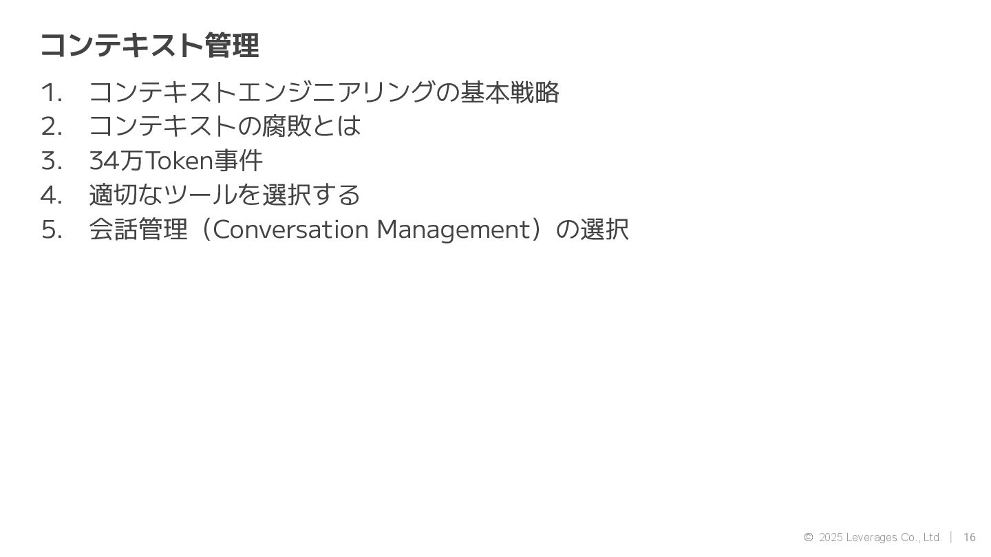 16 © 2025 Leverages Co., Ltd. コンテキスト管理 1. コンテキストエンジニアリングの基本戦略 2.