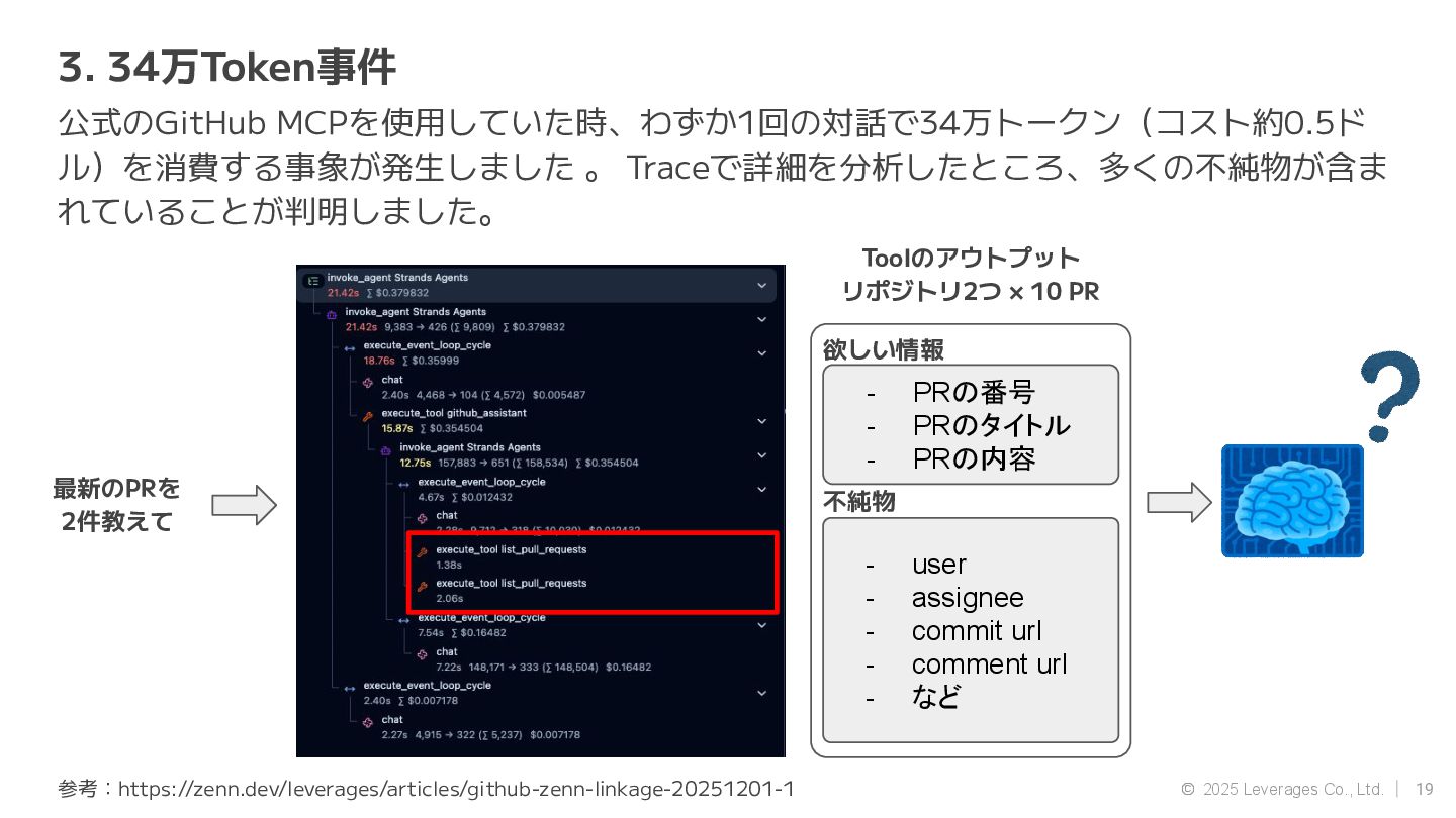 ル)を消費する事象が発生しました 。 Traceで詳細を分析したところ、多くの不純物が含ま れていることが判明しました。 参考:https://zenn.dev/leverages/articles/github-zenn-linkage-20251201-1 Toolのアウトプット リポジトリ2つ × 10 PR - PRの番号 - PRのタイトル - PRの内容 欲しい情報 - user - assignee - commit url - comment url - など 不純物 最新のPRを 2件教えて