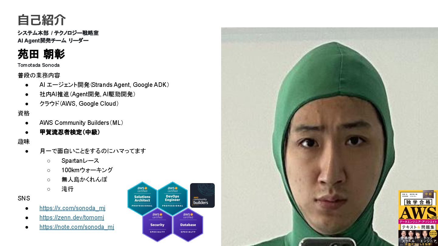 AI エージェント開発(Strands Agent, Google ADK) • 社内AI推進(Agent開発, AI駆動開発) • クラウド(AWS, Google Cloud) 資格 • AWS Community Builders(ML) • 甲賀流忍者検定(中級) 趣味 • 月一で面白いことをするのにハマってます ◦ Spartanレース ◦ 100kmウォーキング ◦ 無人島かくれんぼ ◦ 滝行 SNS • https://x.com/sonoda_mj • https://zenn.dev/tomomj • https://note.com/sonoda_mj Tomotada Sonoda システム本部 / テクノロジー戦略室 AI Agent開発チーム リーダー 自己紹介