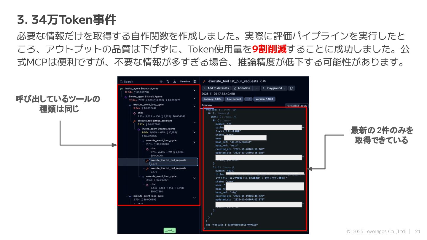 20 © 2025 Leverages Co., Ltd. 3. 34万Token事件 必要な情報だけを取得する自作関数を作成しました。実際に評価パイプラインを実行したと ころ、アウトプットの品質は下げずに、Token使用量を9割削減することに成功しました。公