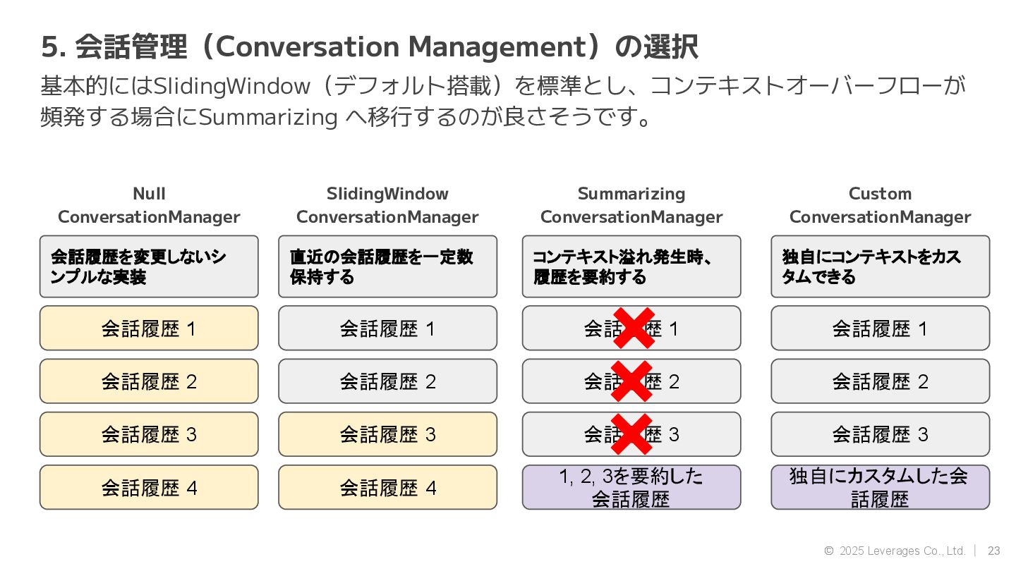 23 © 2025 Leverages Co., Ltd. 5. 会話管理(Conversation Management)の選択 基本的にはSlidingWindow(デフォルト搭載)を標準とし、コンテキストオーバーフローが