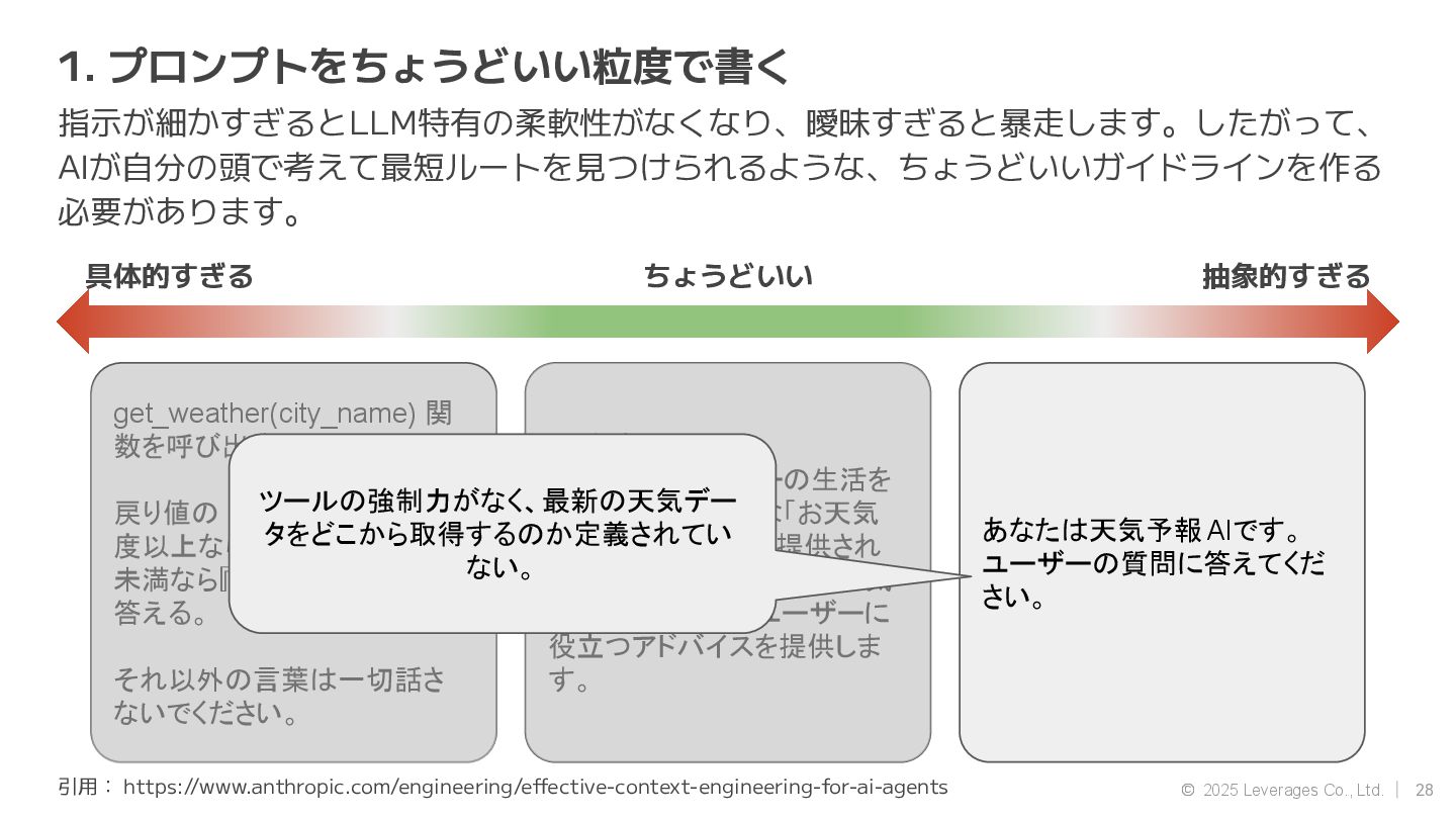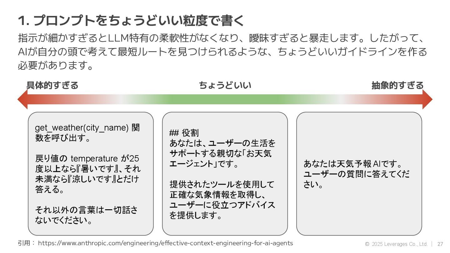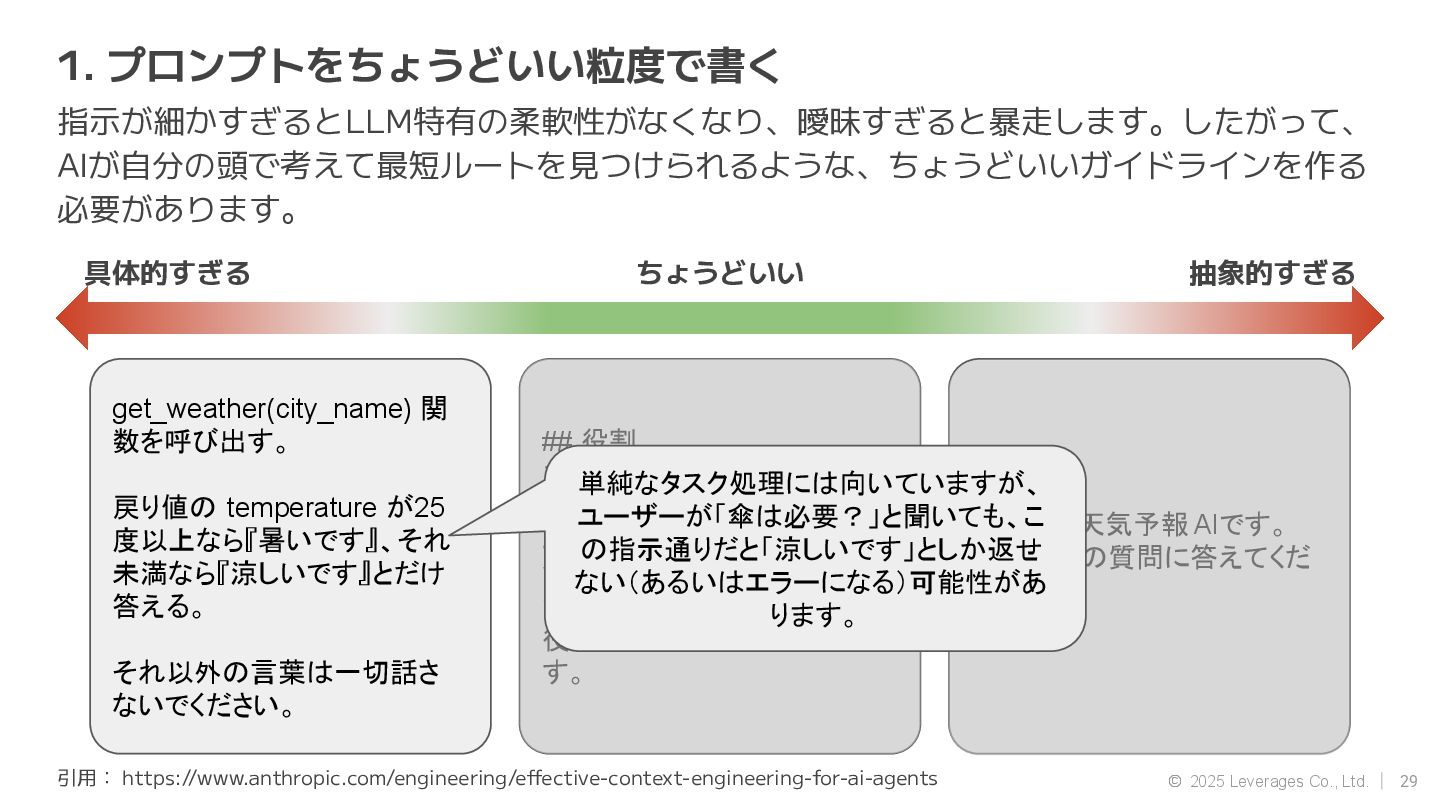 必要があります。 get_weather(city_name) 関 数を呼び出す。 戻り値の temperature が25 度以上なら『暑いです』、それ 未満なら『涼しいです』とだけ 答える。 それ以外の言葉は一切話さ ないでください。 ## 役割 あなたは、ユーザーの生活を サポートする親切な「お天気 エージェント」です。提供され たツールを使用して正確な気 象情報を取得し、ユーザーに 役立つアドバイスを提供しま す。 あなたは天気予報AIです。 ユーザーの質問に答えてくだ さい。 具体的すぎる 抽象的すぎる ちょうどいい 引用: https://www.anthropic.com/engineering/effective-context-engineering-for-ai-agents 単純なタスク処理には向いていますが、 ユーザーが「傘は必要?」と聞いても、こ の指示通りだと「涼しいです」としか返せ ない(あるいはエラーになる)可能性があ ります。