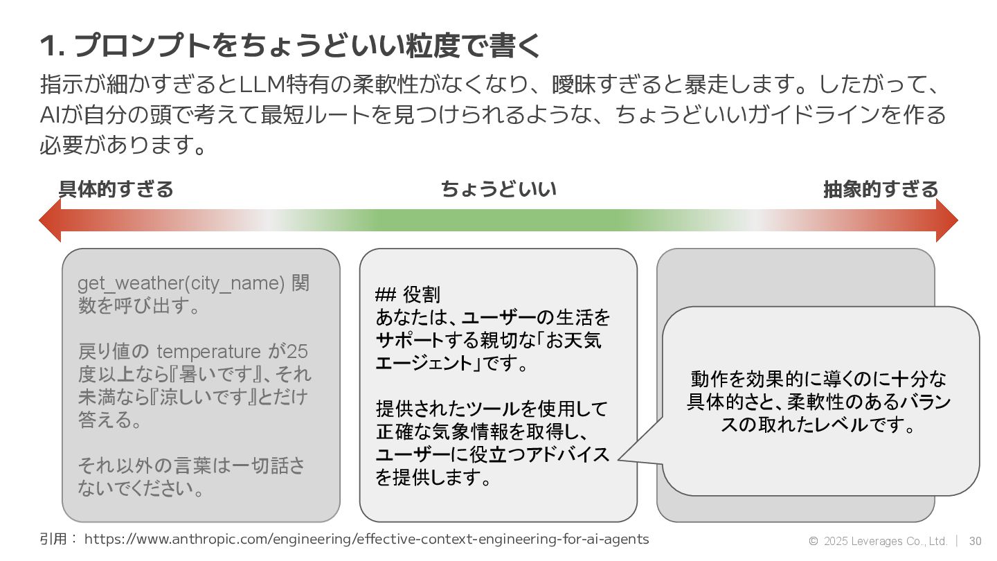 29 © 2025 Leverages Co., Ltd. 1. プロンプトをちょうどいい粒度で書く 指示が細かすぎるとLLM特有の柔軟性がなくなり、曖昧すぎると暴走します。したがって、 AIが自分の頭で考えて最短ルートを見つけられるような、ちょうどいいガイドラインを作る
