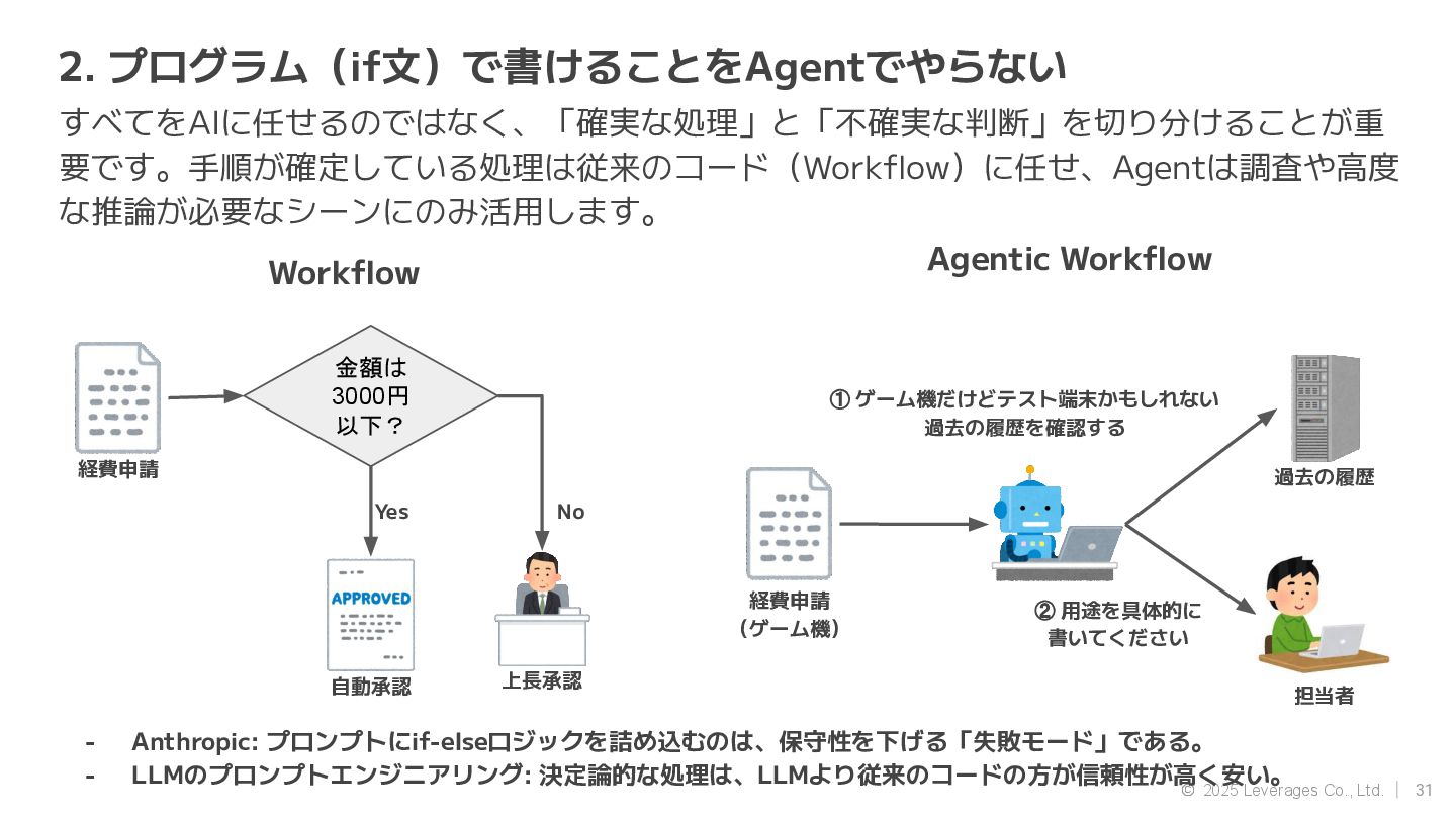 プログラム(if文)で書けることをAgentでやらない Workflow Agentic Workflow 金額は 3000円 以下? 経費申請 自動承認 Yes 上長承認 No 経費申請 (ゲーム機) 過去の履歴 ① ゲーム機だけどテスト端末かもしれない 過去の履歴を確認する 担当者 ② 用途を具体的に 書いてください - Anthropic: プロンプトにif-elseロジックを詰め込むのは、保守性を下げる「失敗モード」である。 - LLMのプロンプトエンジニアリング: 決定論的な処理は、LLMより従来のコードの方が信頼性が高く安い。