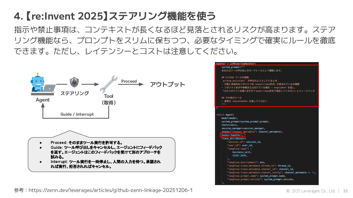 34 © 2025 Leverages Co., Ltd. 4. 【re:Invent 2025】ステアリング機能を使う 参考:https://zenn.dev/leverages/articles/github-zenn-linkage-20251206-1