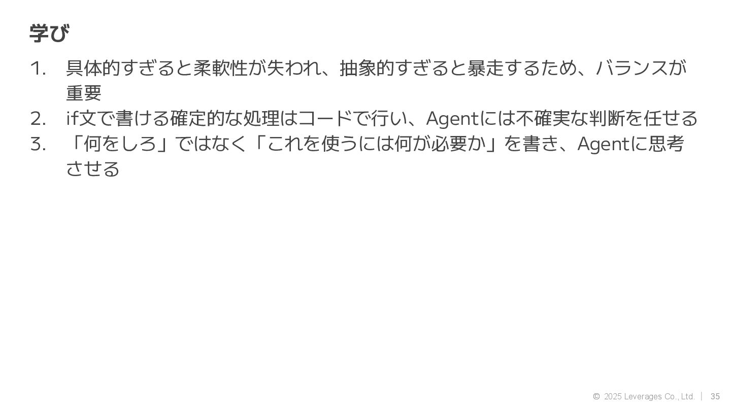 32 © 2025 Leverages Co., Ltd. 3. 指示ではなく、ツールの使い方を記載する プロンプトに手順を書くと柔軟性が失われます。Agentにはツールの利用条件のみを提示 し、具体的な実行手順を委ねることで、状況に応じた柔軟な対応が可能になります。