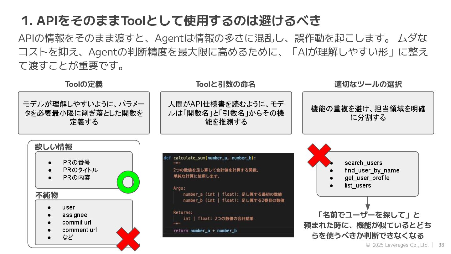 37 © 2025 Leverages Co., Ltd. Tool設計 1. APIをそのままToolとして使用するのは避けるべき 2.