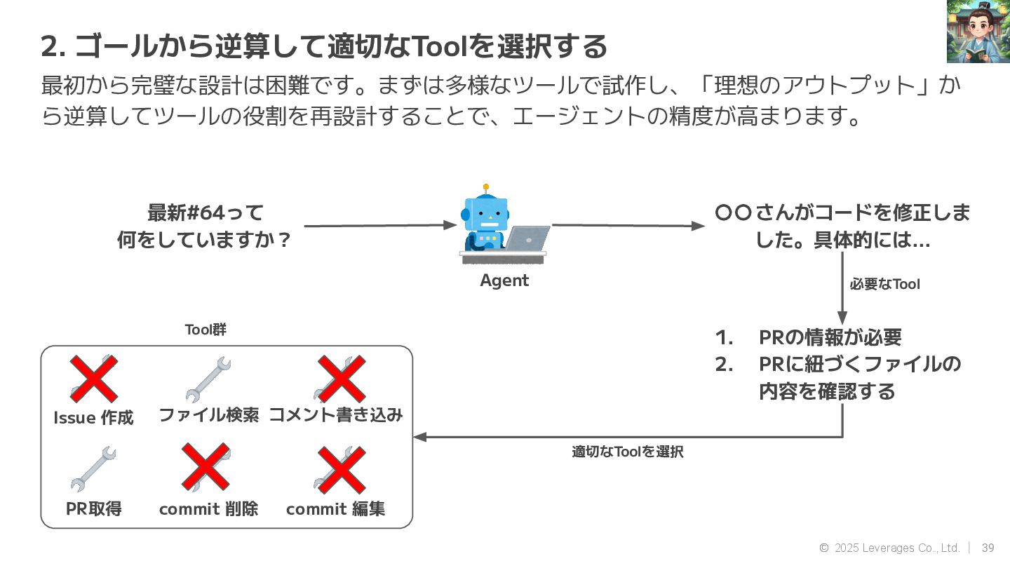 39 © 2025 Leverages Co., Ltd. 2. ゴールから逆算して適切なToolを選択する 最初から完璧な設計は困難です。まずは多様なツールで試作し、「理想のアウトプット」か ら逆算してツールの役割を再設計することで、エージェントの精度が高まります。