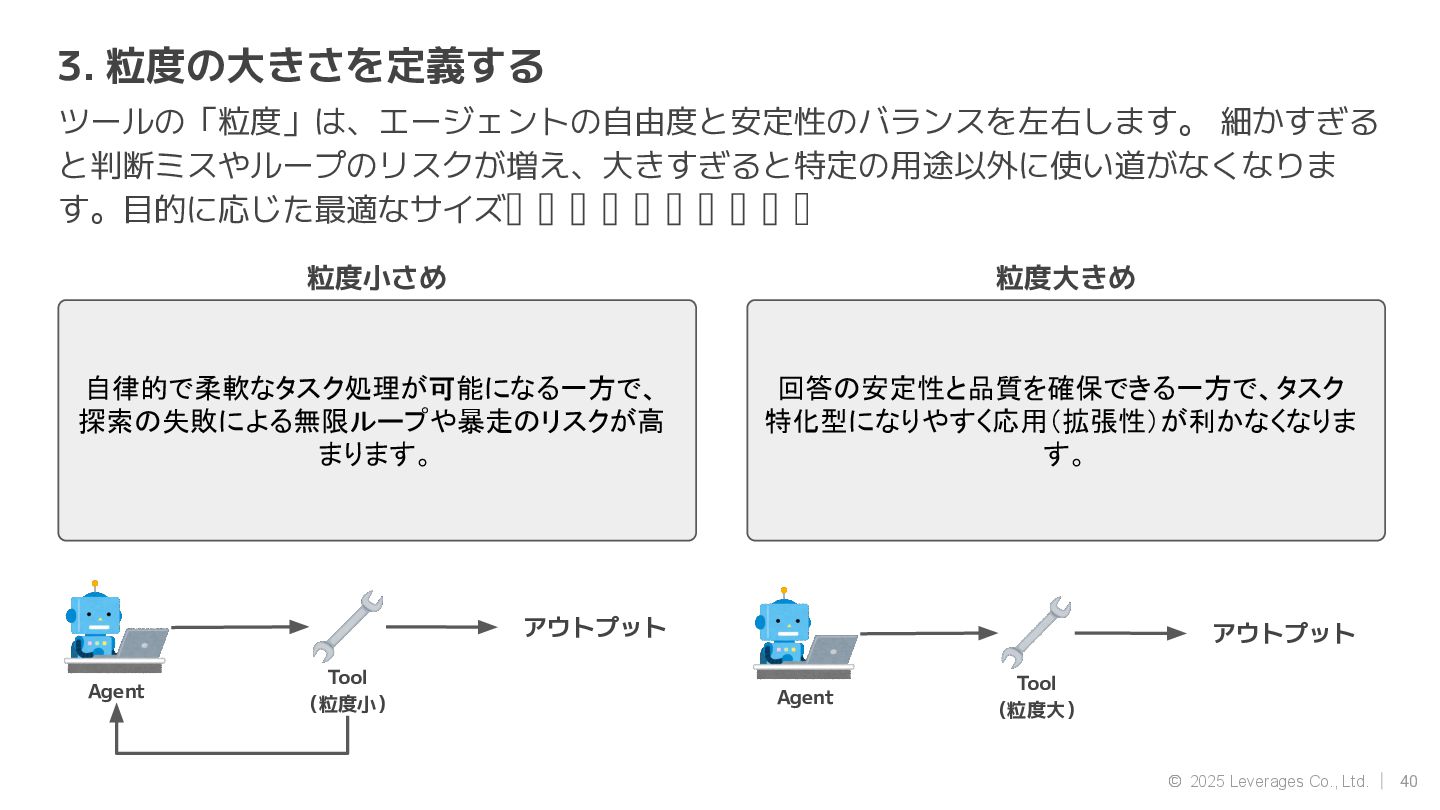 40 © 2025 Leverages Co., Ltd. 3. 粒度の大きさを定義する ツールの「粒度」は、エージェントの自由度と安定性のバランスを左右します。 細かすぎる