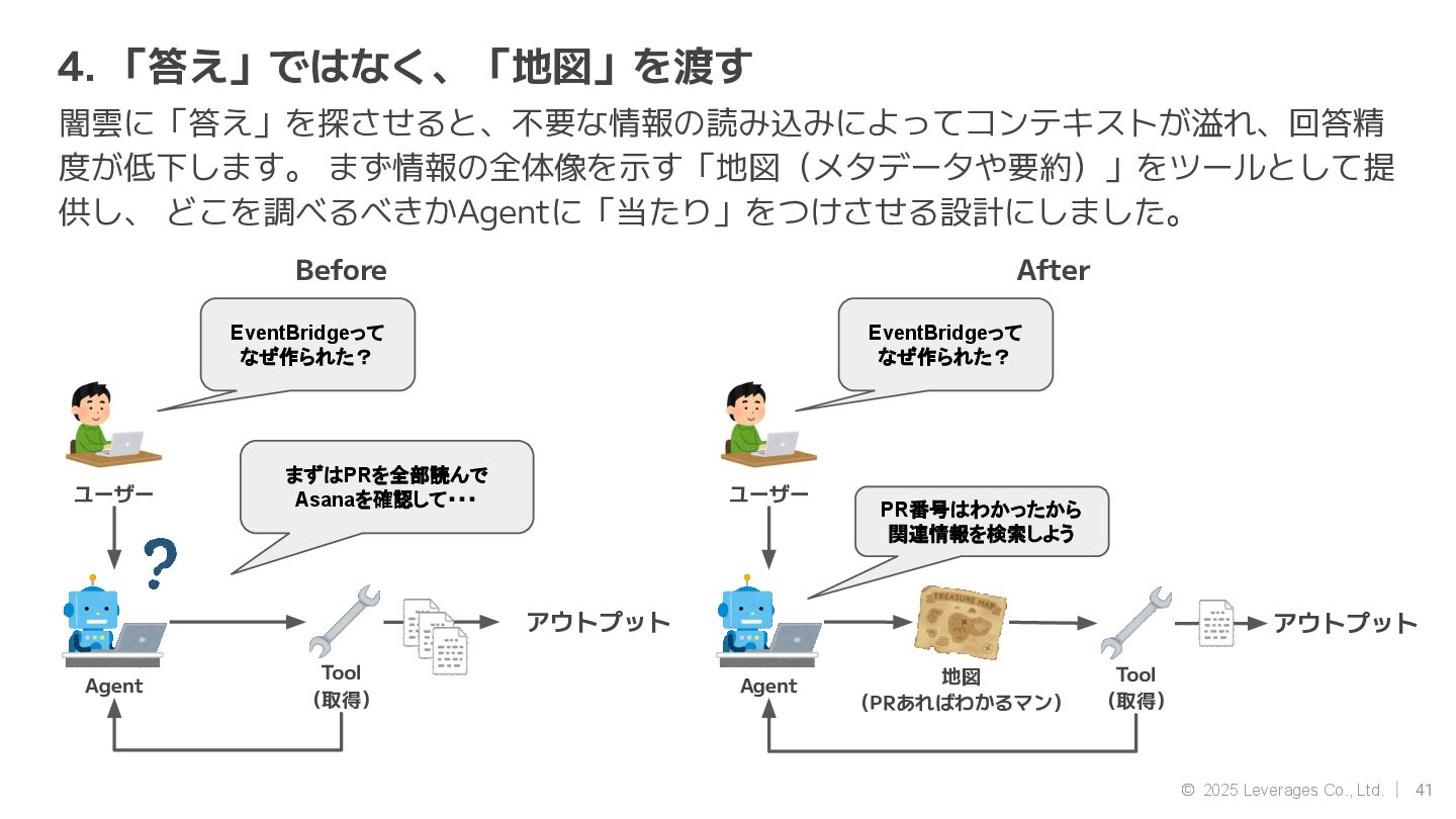41 © 2025 Leverages Co., Ltd. 4. 「答え」ではなく、「地図」を渡す 闇雲に「答え」を探させると、不要な情報の読み込みによってコンテキストが溢れ、回答精 度が低下します。
